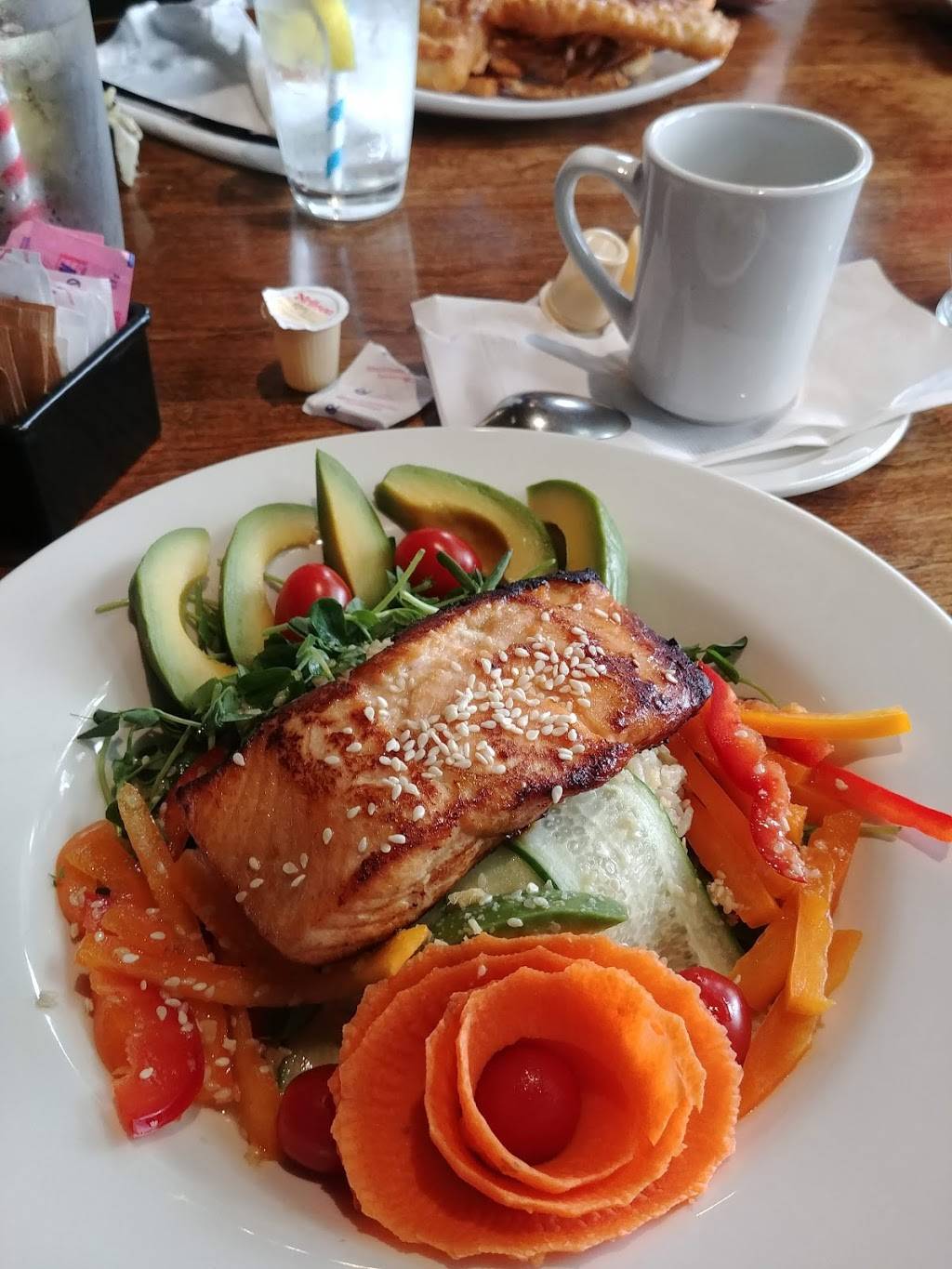 Nice patio with a lovely lake view. Caribbean salad was flavourful, chicken quality and quantity was decent, and they allowed free modifications to switch ingredients. The server, Faith, was bubbly and the perfect amount of attentive. Great selection of drinks on tap and I very much enjoyed the dry cider.