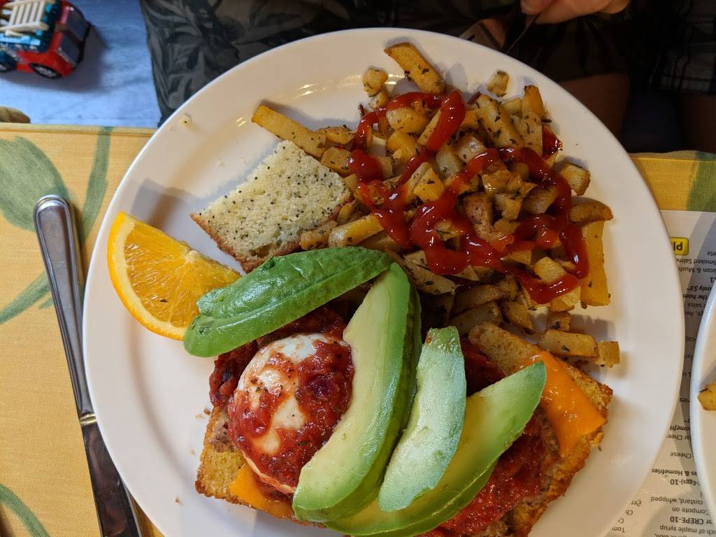 Super huevos rancheros, served with a tiny slice of poppy seed loaf as a breakfast dessert. The salsa on the side was unique, probably made on site.