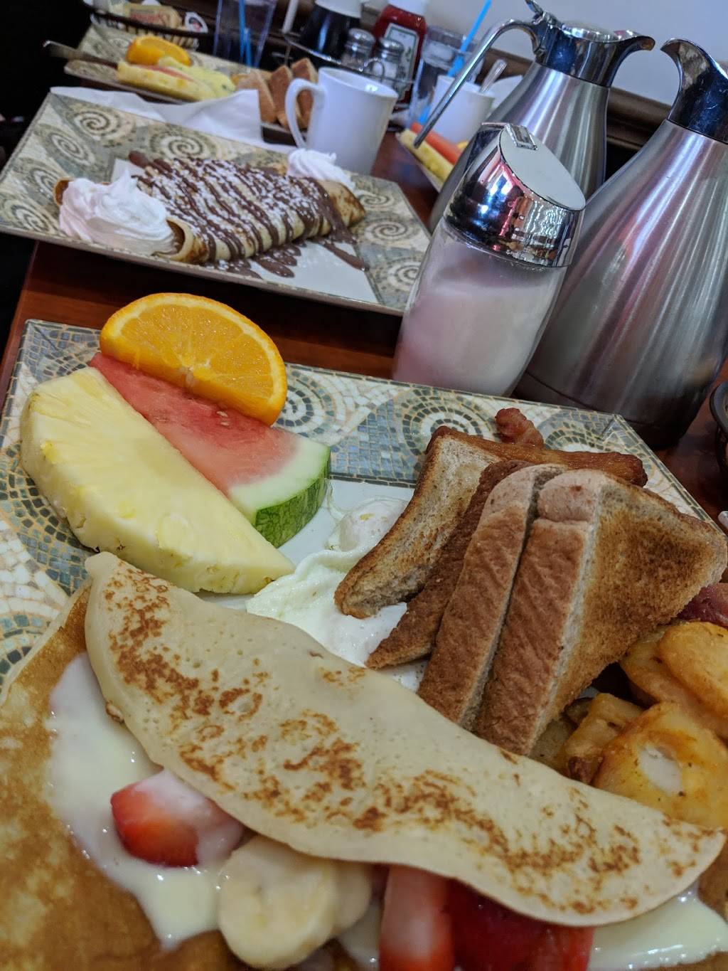 We had the crepes (strawberry with strawberry sauce and chocolate and Nutella). The food came quickly and tasted great. Generous portions as well. Price was reasonable. And the service was friendly. Restaurant was clean and tasteful, modern decor. I would definitely return and recommend.