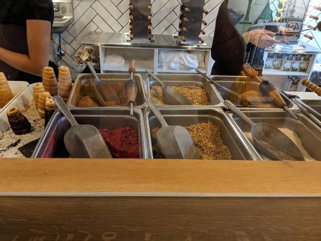 I went to Eva's Original Chimneys for the first time with my wife and kids. They have a decent layout though more chairs inside would be appreciated as we had no room to sit. The staff was friendly and they explained the process to us. The service was decently quick, considering how packed the place was. The downside is the wooden "spoons". As an adult I can appreciate the uniqueness and novelty of the wooden sticks, but these are completely impractical for a toddler and young child. Luckily for us we had a spoon with us in our backpack. The chimneys were delicious, I had the apple crumble, my wife had the oreo cheesecake and the kids shared an original Oreo (in a cup). All delicious and very original. Worth a try.