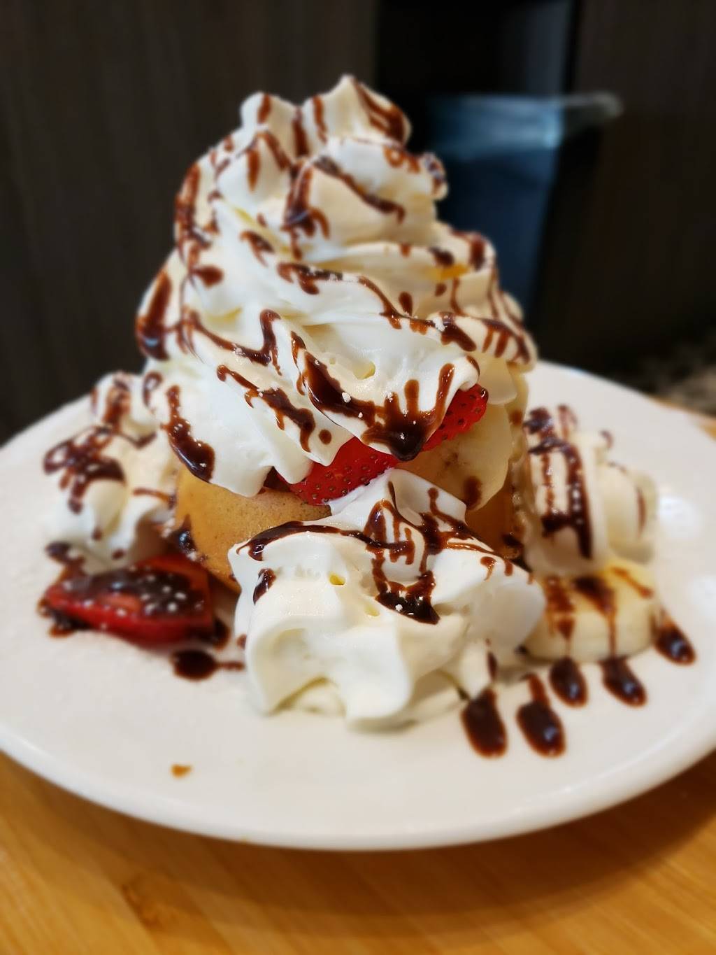 For dessert ordered the strawberry and bananas on a waffle with whipped cream and chocolate syrup.