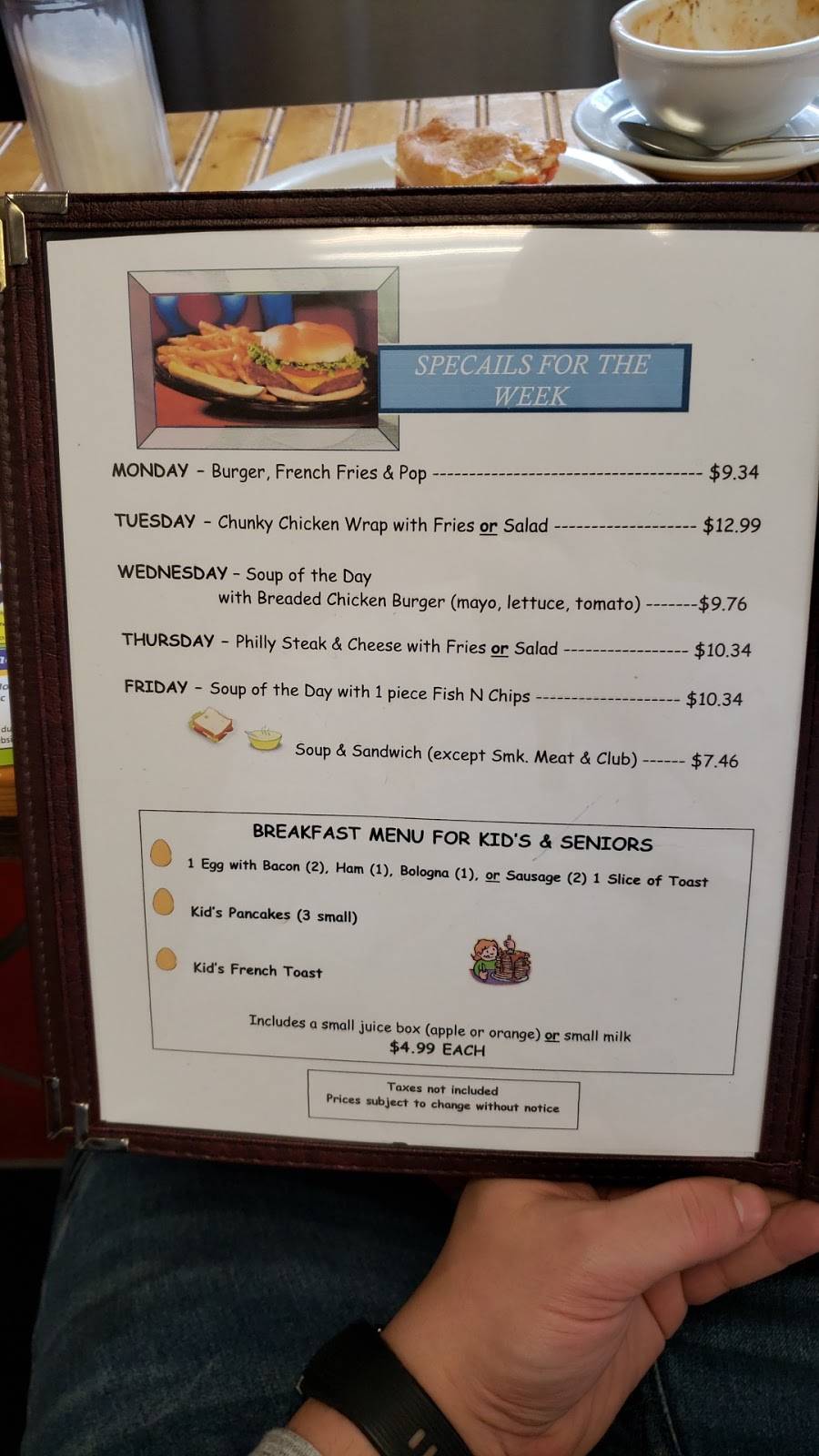 Lovely family style diner in the heart of charming downtown Arnprior. Our waitress was super friendly and was very accommodating to my little great niece! Food was delicious, especially the chicken burger that was made with a fresh chicken breast. Very affordable and quick service. Interior is a bit dated, but very homey! Highly Recommend.