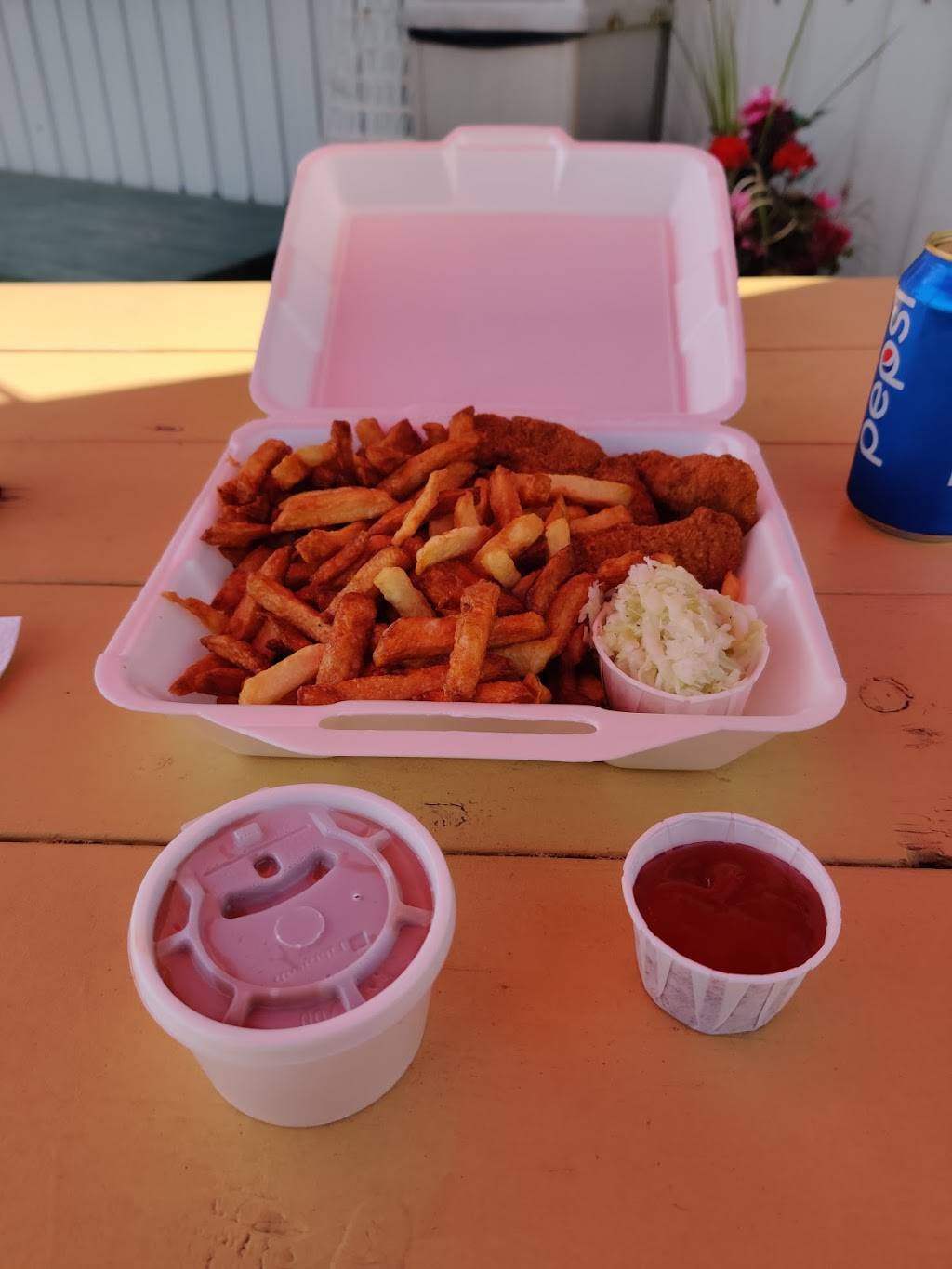 Frites croustillantes, la sauce bbq est bonne. Le hot dog n'était pas bon. Lanières de poulet sont très bonnes. Terrasse sur la rue très bruyante.
