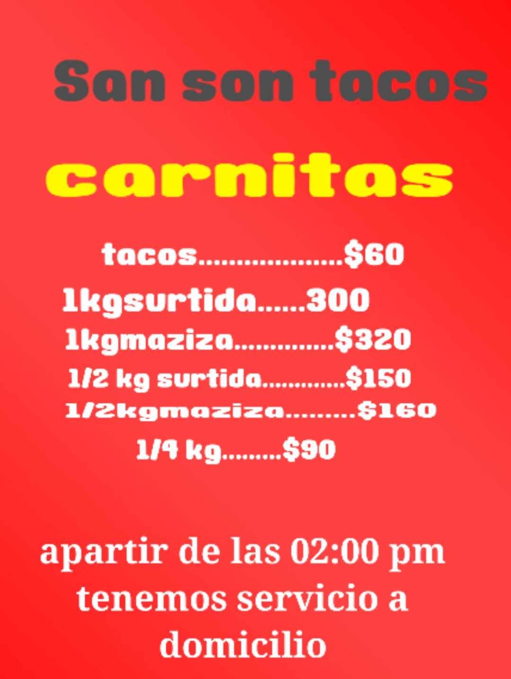 You can review this Business and help others by leaving a comment. If you want to share your thoughts about SAN SON TACOS, use the form below and your opinion, advice or comment will appear in this space.