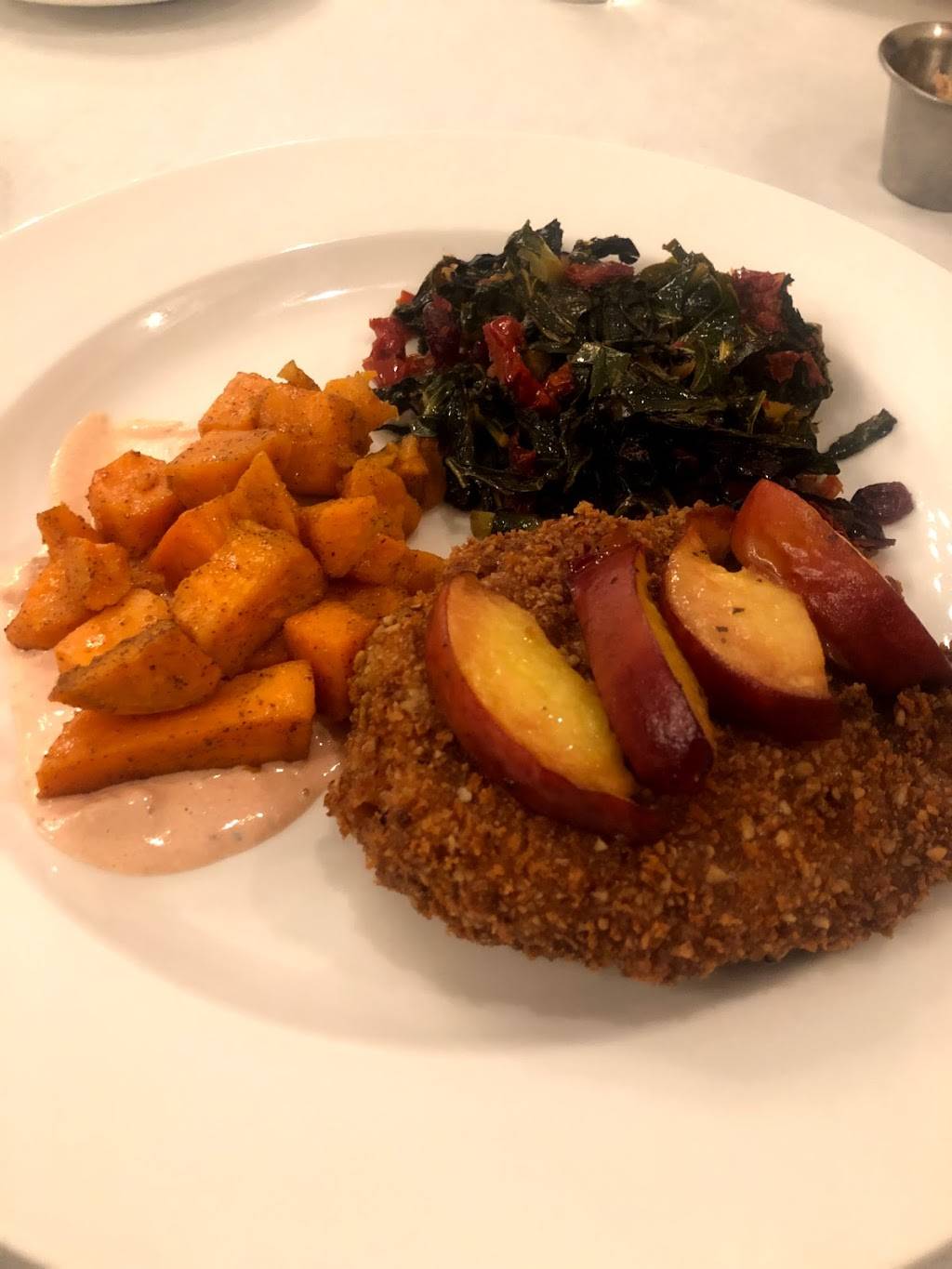 Very fresh appetizers. Chicken was well presented and very moist and tender. Green beans were crisp, but a bit too salty for my taste. Good quality salt, however. Bread pudding was outstanding.