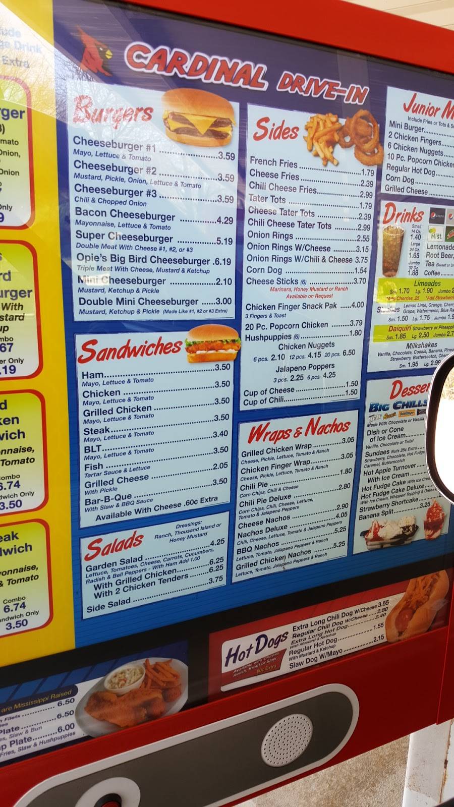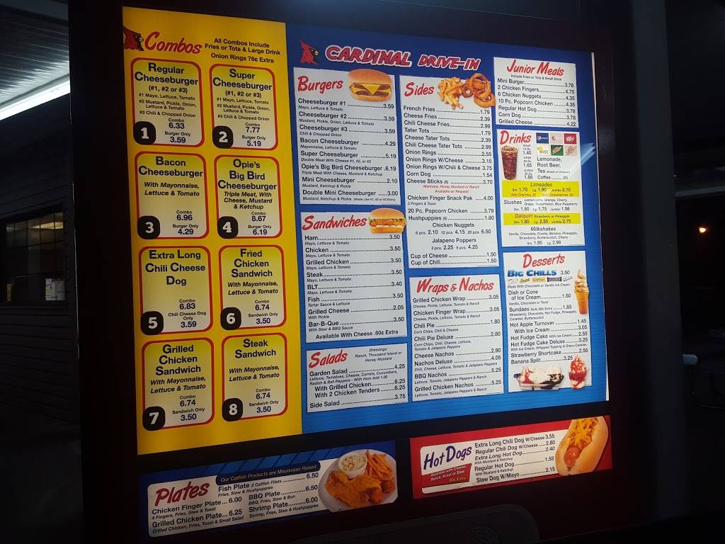 The Cardinal Drive In has great food, from a hamburger, or chicken salad to ice cream. Great folks, we eat there several times a week.