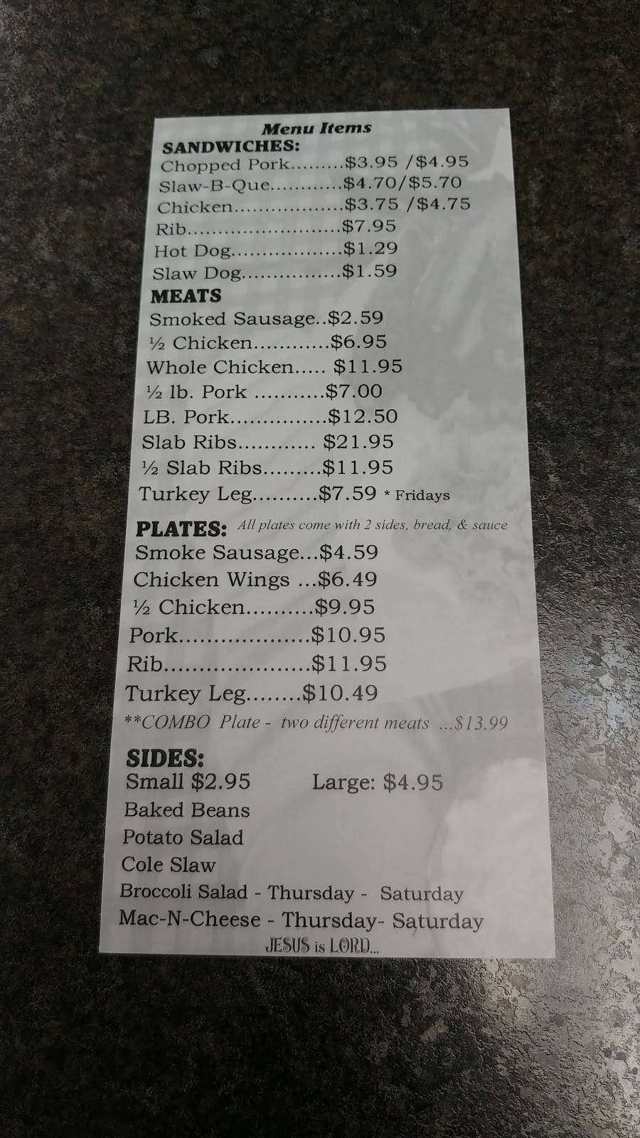 The place is plain on the inside, but the food well makes up for it. The pulled pork and ribs were both juicy with a nice smokey flavor. Portion size for the platter fed me for two meals. The price is very reasonable.