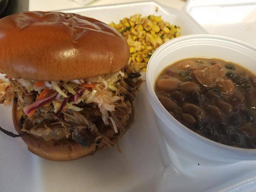 This ex. Military side of the road B.B.Q pit delivered a wonderful handmade meal. When I tried the beans. They brought A satisfying smile to my face. I ordered a raindeer hot dog topped with pulled pork and cole slaw. With a side of fried okra. And a side of beans in a combo fit to satisfy my hunger