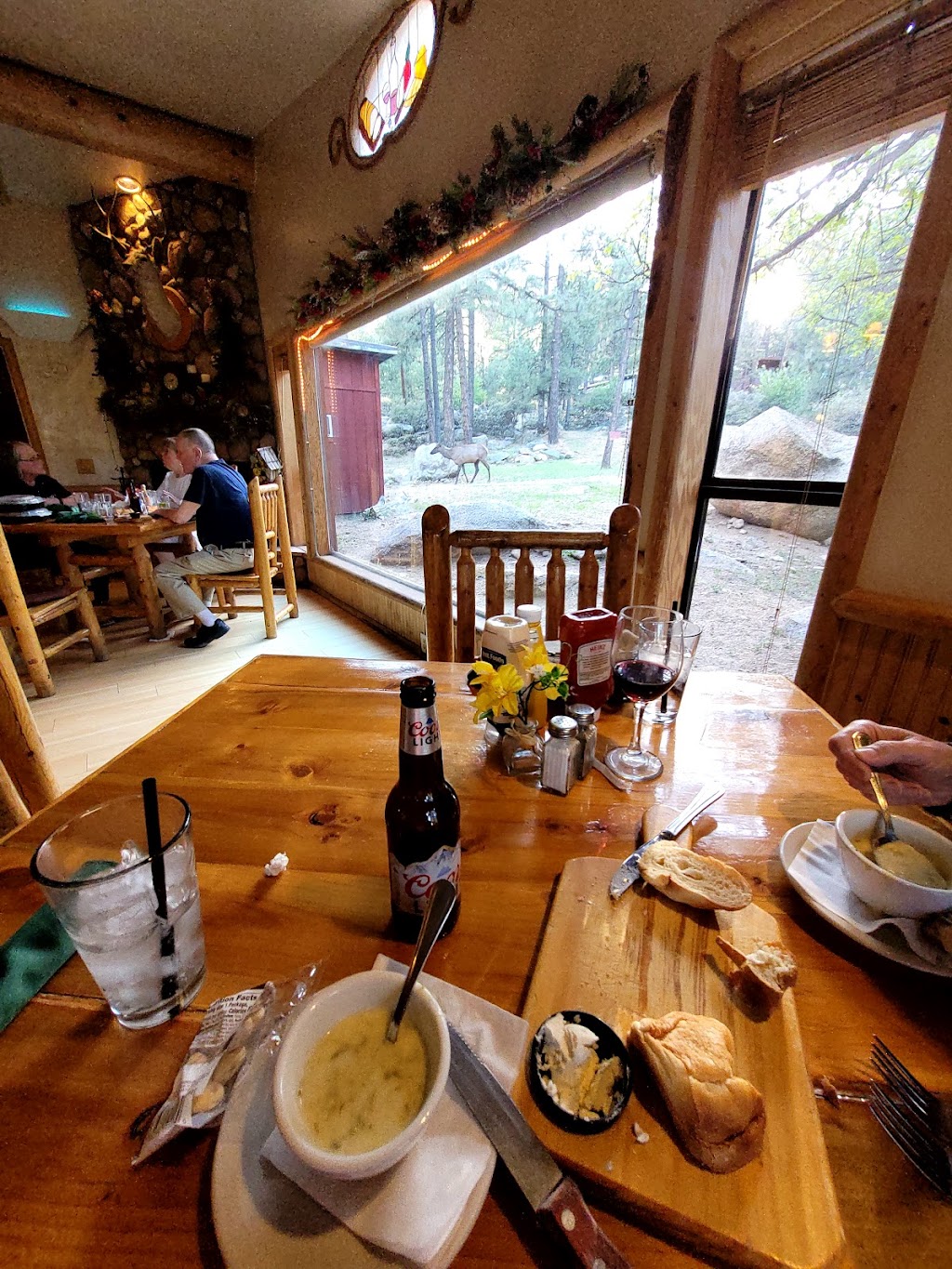 There is a large picture window to watch wildlife while dining, great view. Some folks were watching the elk and then said check it out there are a whole bunch of babies. This is March so I was surprised and went out to see what they were talking about, it was a herd of deer they thought were elk babies. Food was good entertainment was priceless.