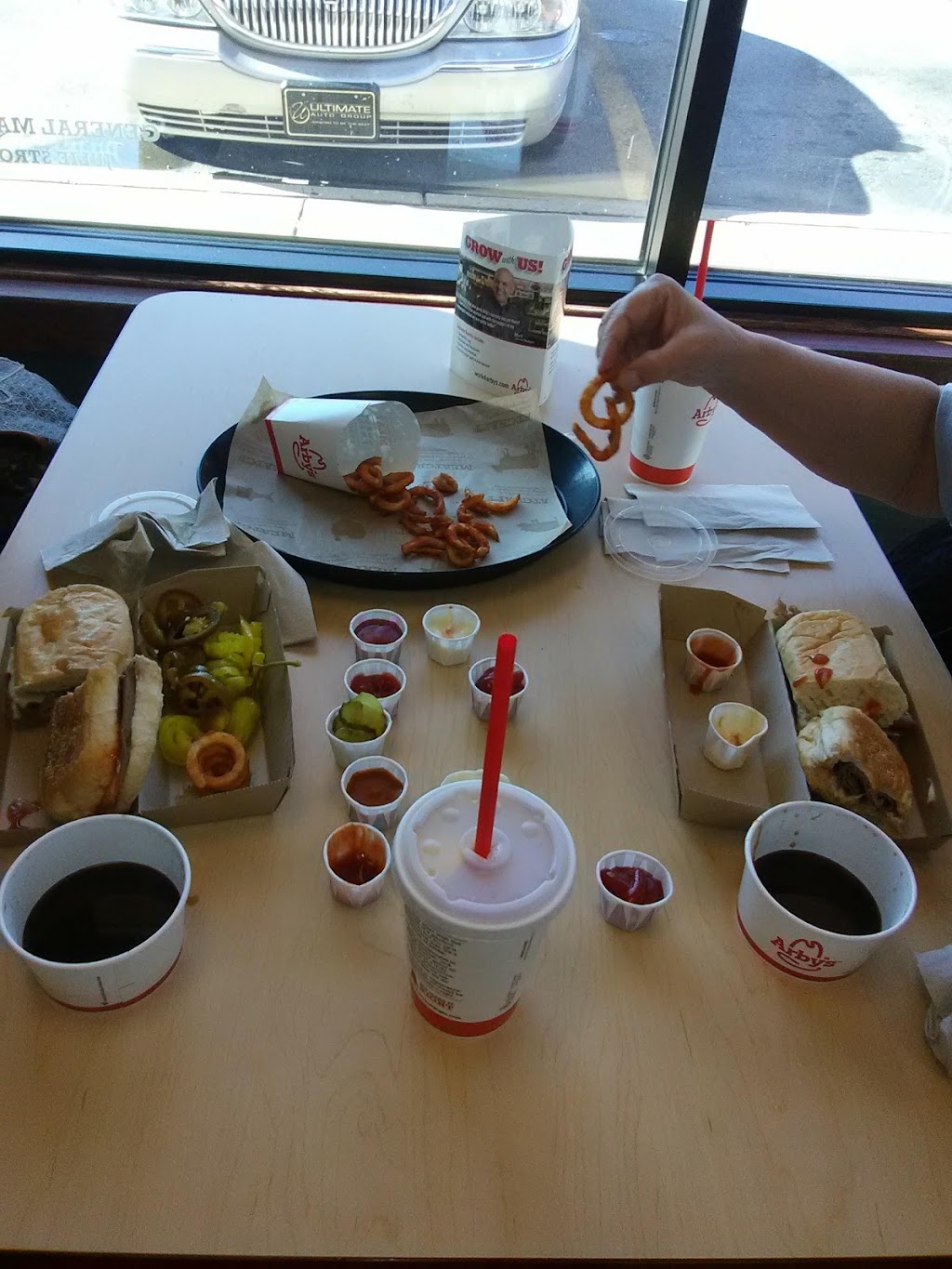 I got my order to go, had to ask for ice from the cashier behind counter. The fries were good but the roast beef sandwich was barely warm. I was going to turn around and complain that day but I was running late so i didn't. I usually don't have issues with this restaurant. May have been an bad day for the crew..