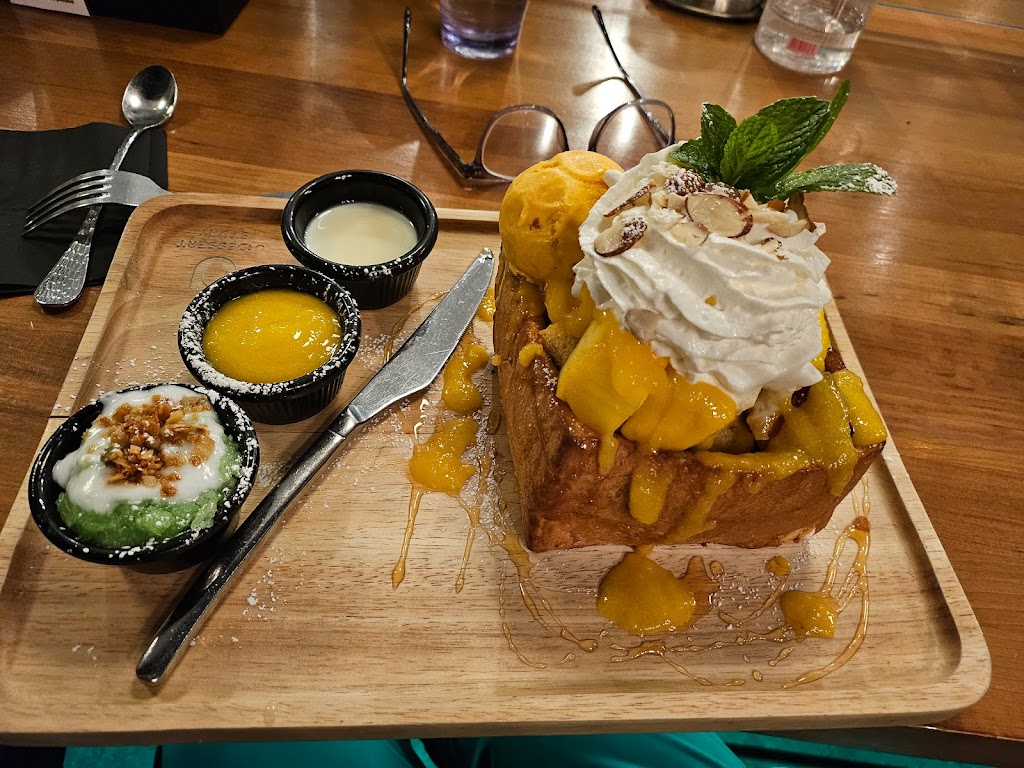 The Thai tea toast is so delicious!!! We ate it second after finishing the mango sticky rice bingsu and it was still so delicious. The toast was hot, and so soaked in the sweet sauce; the texture of the bread was lovely and came in lovely presentation with fruits. The mango sticky rice bingsu was also really delicious, with a really nice fine bingsu texture, not just chunks of ice. The quality of all the fruits they used was really high too. Not a huge fan of the sticky rice but that might just be me. The drinks are not really worth it. I got a matcha strawberry fizz and the matcha flavor was not super strong and the drink was pretty watery, pretty much just like strawberry lemonade. My friend got the blue lychee drink which was pretty good but tasted like any lychee tea drink with popping boba. Really nice environment and good service too!