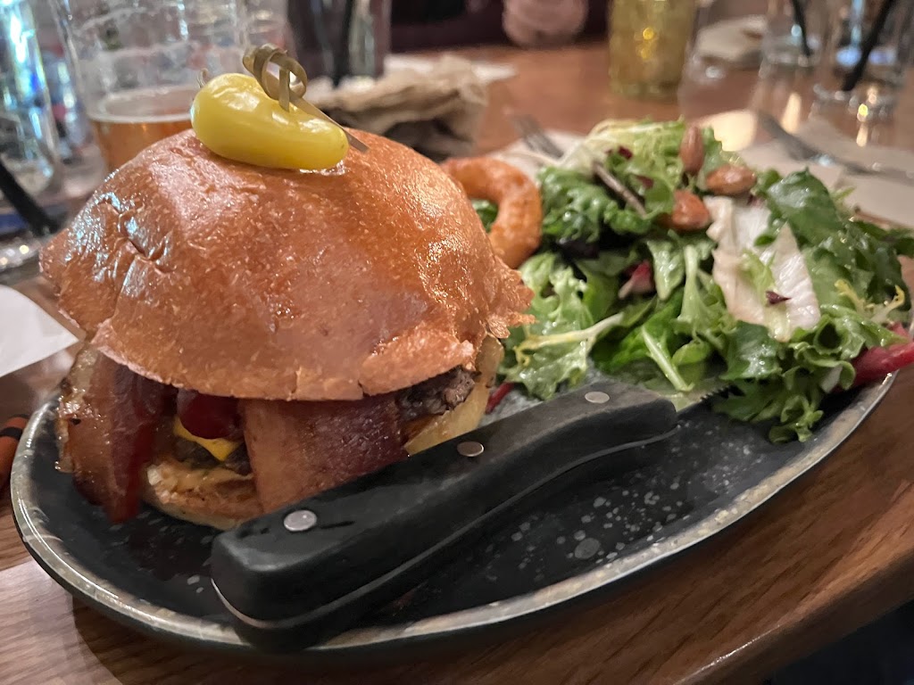 My husband and I ate here last night and we absolutely loved it. The ambience of the restaurant is awesome. It was a little noisy for my taste but that was to be expected for a Friday night. Especially with the street fair going on right outside. Our server Edgar was awesome and attentive. He made sure we weren't wanting for anything. The food was amazing!! I don't know what they put in that poutine but I could eat that whole bowl by myself. I got the drunken pig burger with tempura onion rings, which were both delicious. My husband got the NY strip with the mashed potatoes and broccolini. His steak was seasoned and cooked to absolute medium rare perfection. The drinks were awesome and reasonably priced. Highly recommend the Samurai Sour and Jackie Treehorn(if you're a Big Lebowski fan, you would be a fan of this drink). We are definitely coming back again. It was the perfect date night.