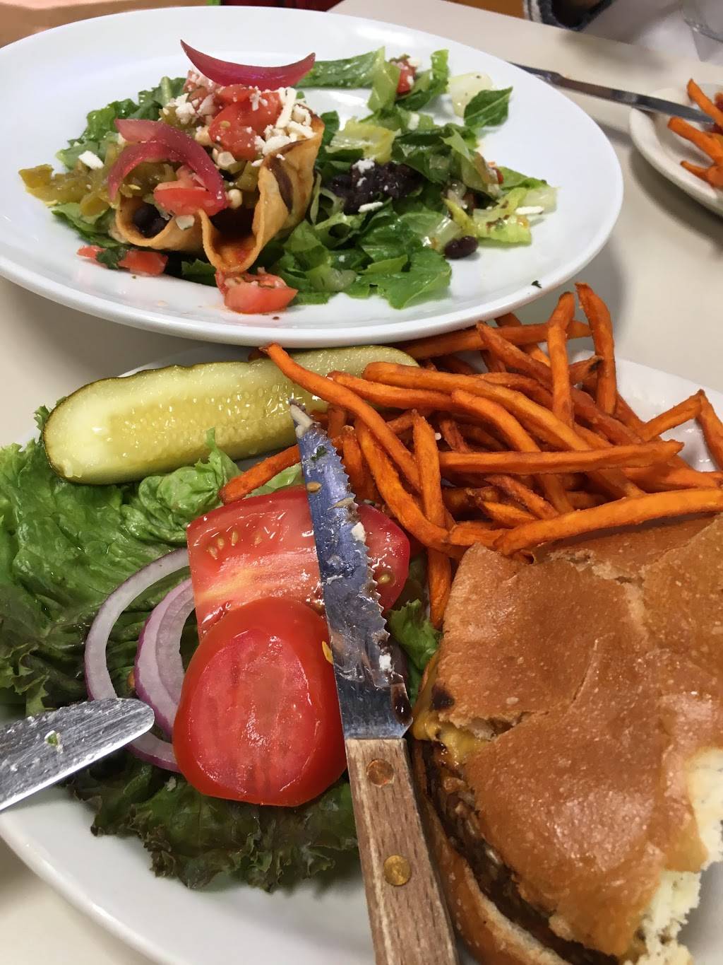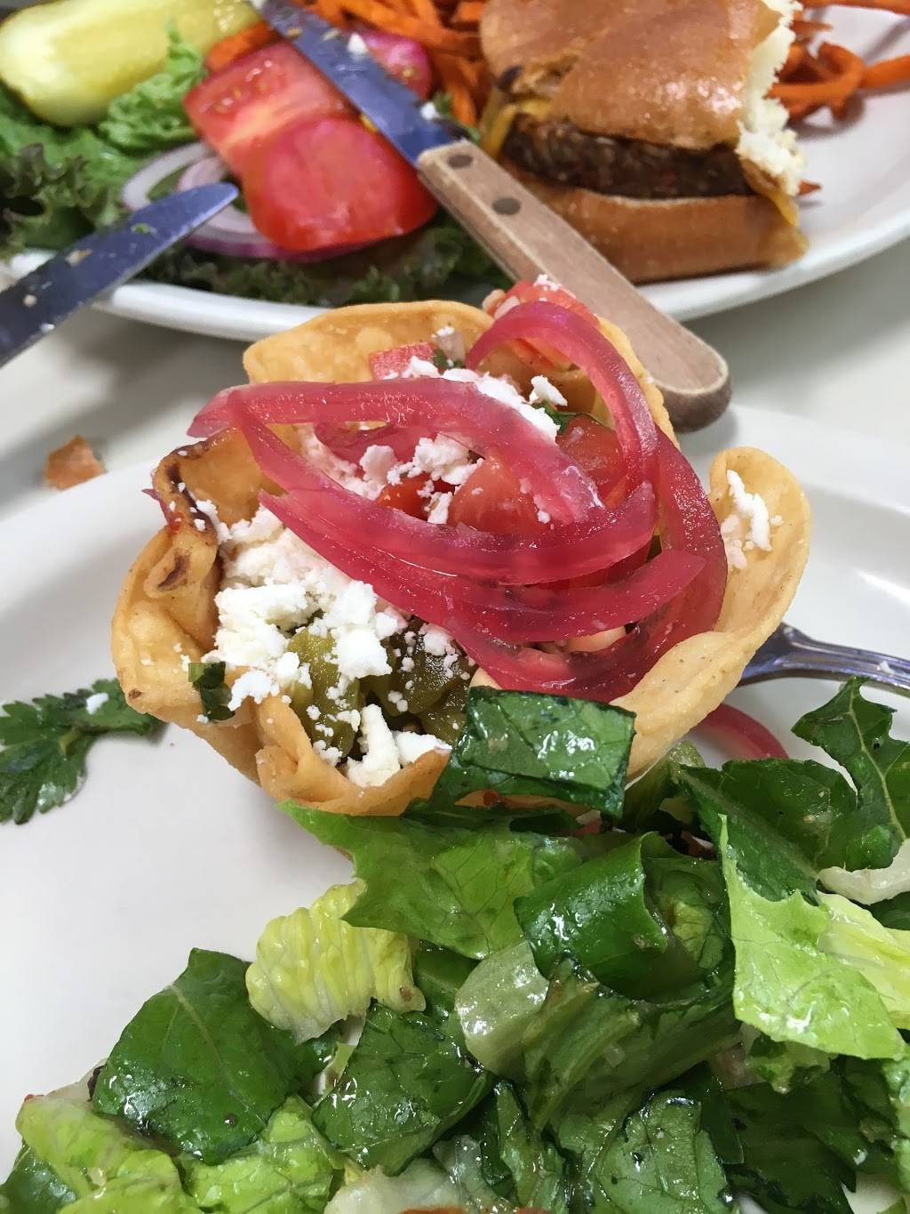 Love, love, love Half Day Cafe! Our server was wonderful! She was observant, quick and so very personable. The place was hoppin busy and she kept her calm and friendliness. Our food was hot and so very tasty. All of us were very sastisfied. My only request is for vegan butter and maybe Beyond brand sausage with my tofu scramble. One of my favorite patio dining places. Inside it is airy, open with great outdoor views of nature.