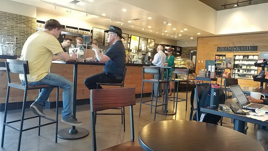 Great service, easy parking and in a center where there are a variety of stores. The drive thru can be a little tight. Store was spacious and clean. Plenty of patio seating, also very clean, and set above busy Highway 49, so not too loud.