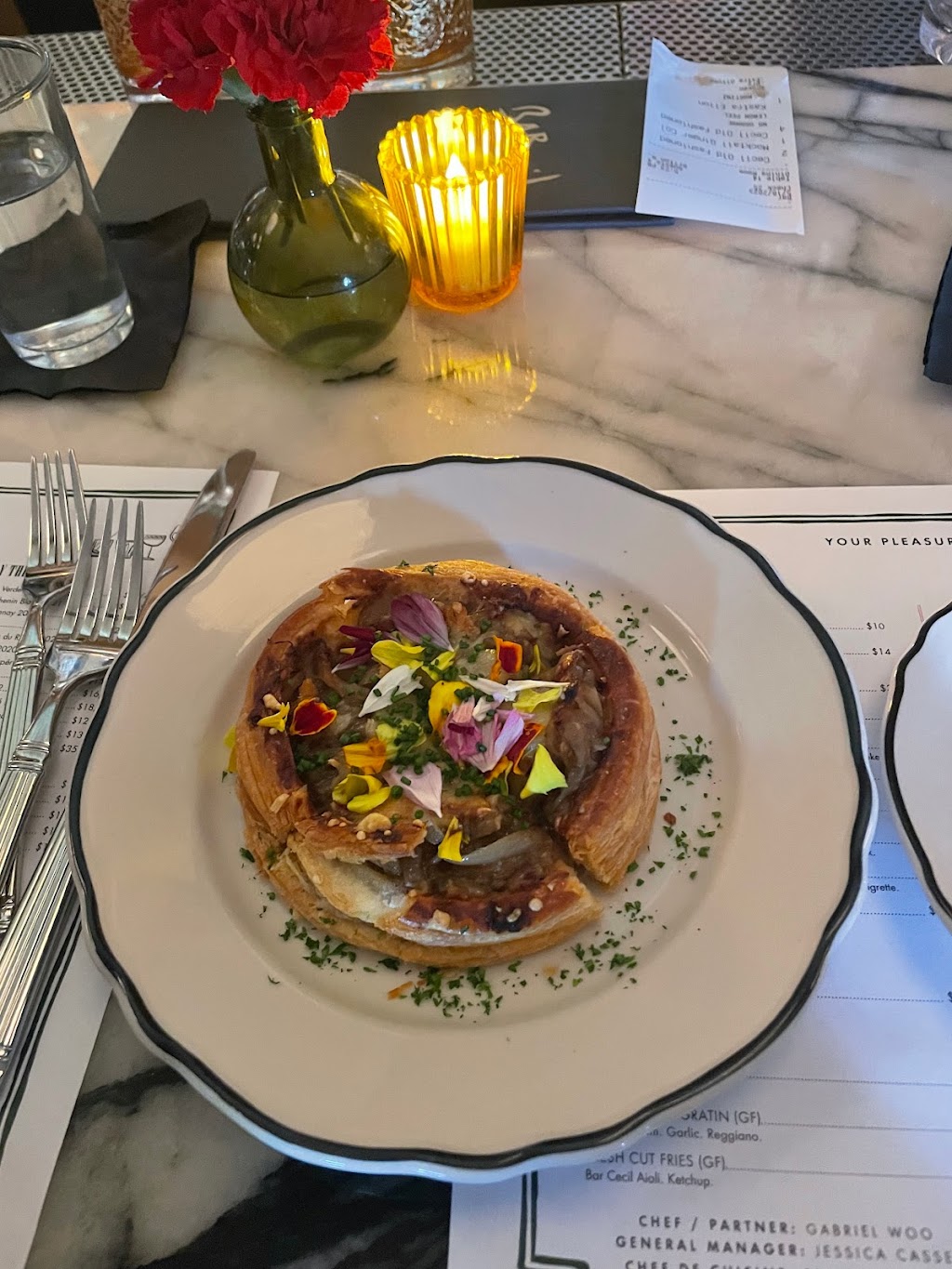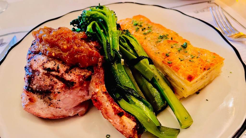 He had the steak and frites and I had the scallops. Both were outstanding and filling. Perfectly prepared and balanced. We also started with the house rolls- also delicious. Oh, and their single person restroom is super cute. Can’t wait to go back again!