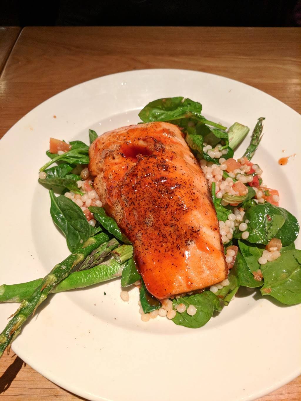 The atmosphere is what stood out exceptionally here: casual and comfortable, yet somewhat refined; clean. Televisions, but not too many as to be intrusive. Open environment, comfortable seating and lighting not too bright or dim, and the wait staff was very attentive. The food was about an 8/10, which is pretty good; slightly pricey. Large portions. The BJ’s craft beer was Tasty ???? For a busy Friday night with no reservation, the time-to-served was good, 30-45 minutes. I would definitely recommend this place