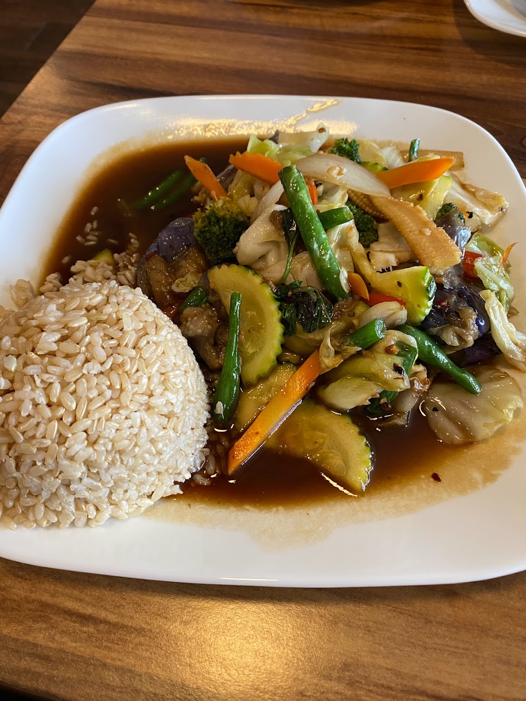 We started off our meal with a wonderfully balanced soup called Tom Kha. This is a very savory and well-balanced soup featuring coconut, ginger, lemon grass with a touch of fish sauce to add just the right amount of saltiness that really elevated the soup. The mushrooms and chicken added just the right amount of body to the soup to really satisfy. Next my wife had the Thai basil beef, the beef was absolutely superb and was so tender. The vegtables were still crispy and the sauce was wonderful and not super spicy like I have had during my travels. I am sure you can have them make it more spicy if you wanted, personally I thought it was superbly balanced. My main course was the Chicken Pad Thai. They really did a great job here on this dish, the sauce had just the right kick of tamarind and the noodles were perfectly cooked so they still had body to them. The chicken was cooked just right and the bean sprouts were nice and crispy. Our dining experience was 5 stars all the way. They even gave my wife a Thai iced tea to go. If your in the Folsom area I highly recommend.