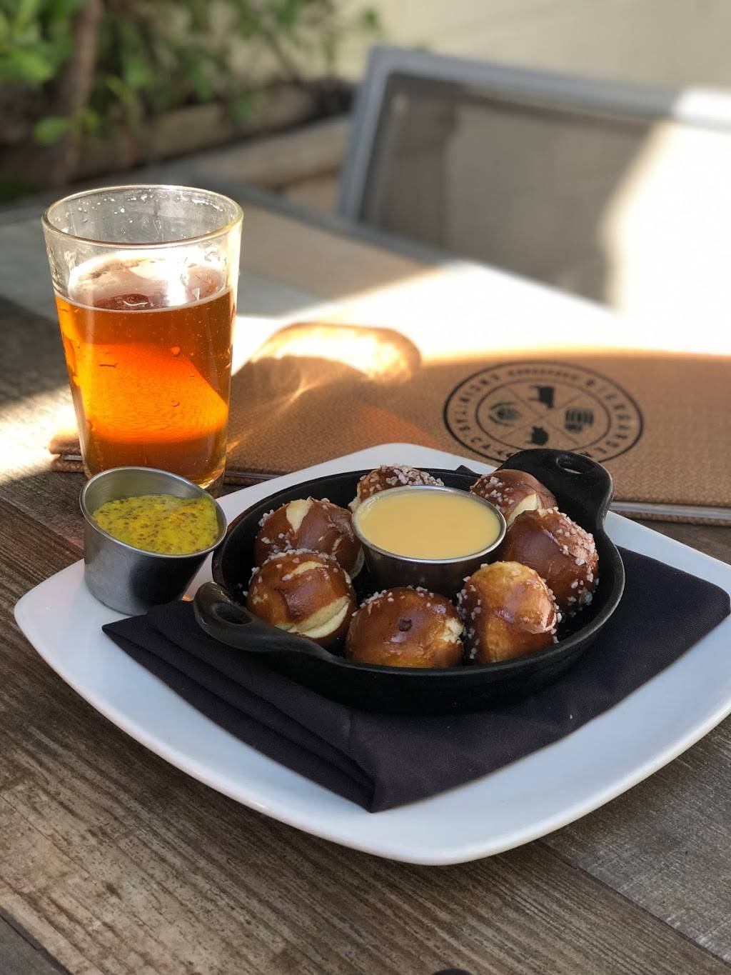 Great food and beer selection. A bit on the pricey side as it was $90+ for 3 of us to eat a light lunch with one round of beers. Very good soft pretzel bites. The chicken taco was just 'so so'. Dog friendly tables at the rear patio.