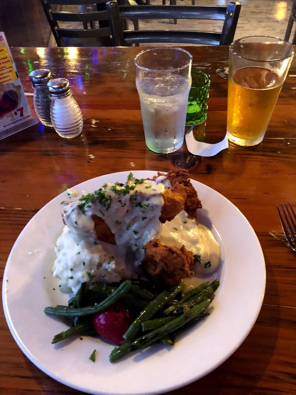 The food here tastes great. We had the fish and chips and chicken fried chicken. Huge portions, that we're very delicious. The service was friendly, but slow. We weren't disappointed. It was nice to sit and talk, but you might prepare for wait time. Expect a laid back, friendly atmosphere. The menu is a bit expensive, but the portions more than make up for the cost. You really could split any of the entrées, they're that large (for our liking, anyway). I give it a four only because some people might want to get in and out faster and you won't likely find that here.