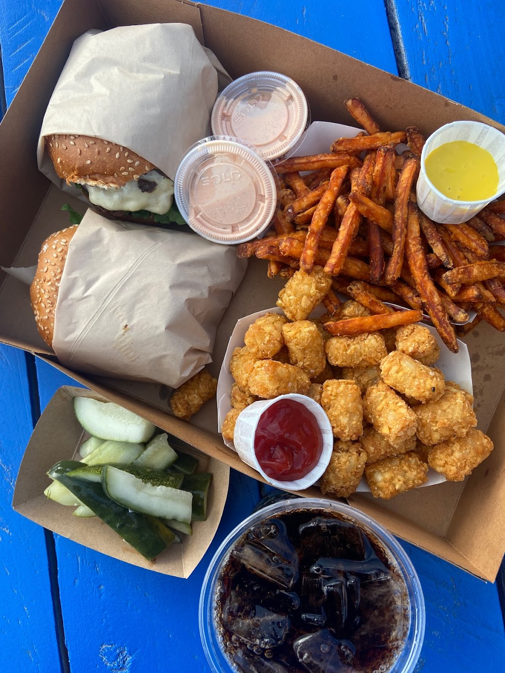 Very cute burger place. They have beautiful outdoor seating and it is so cute. The food is delicious. We got sweet potato fries, tots, chicken Sandwhich and sonoma mountain beef company burger.