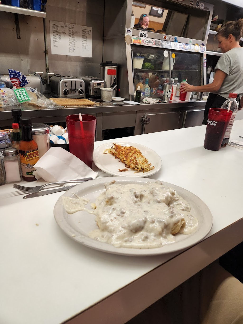 Old classic style diner with sweet staff. My table mate Kristen didn’t ever get her sourdough, rather some normal toast and boy was she livid. The cure is fuggin amazing. The hot cakes wonderful but still not sure of the diff between hot cakes and pan cakes like is it a superiority thing? Hand is up for hot cake size comparison. Biscuits and gravy were a little chilly but staff was great about heating them back up. Very busy spot because it’s so good.