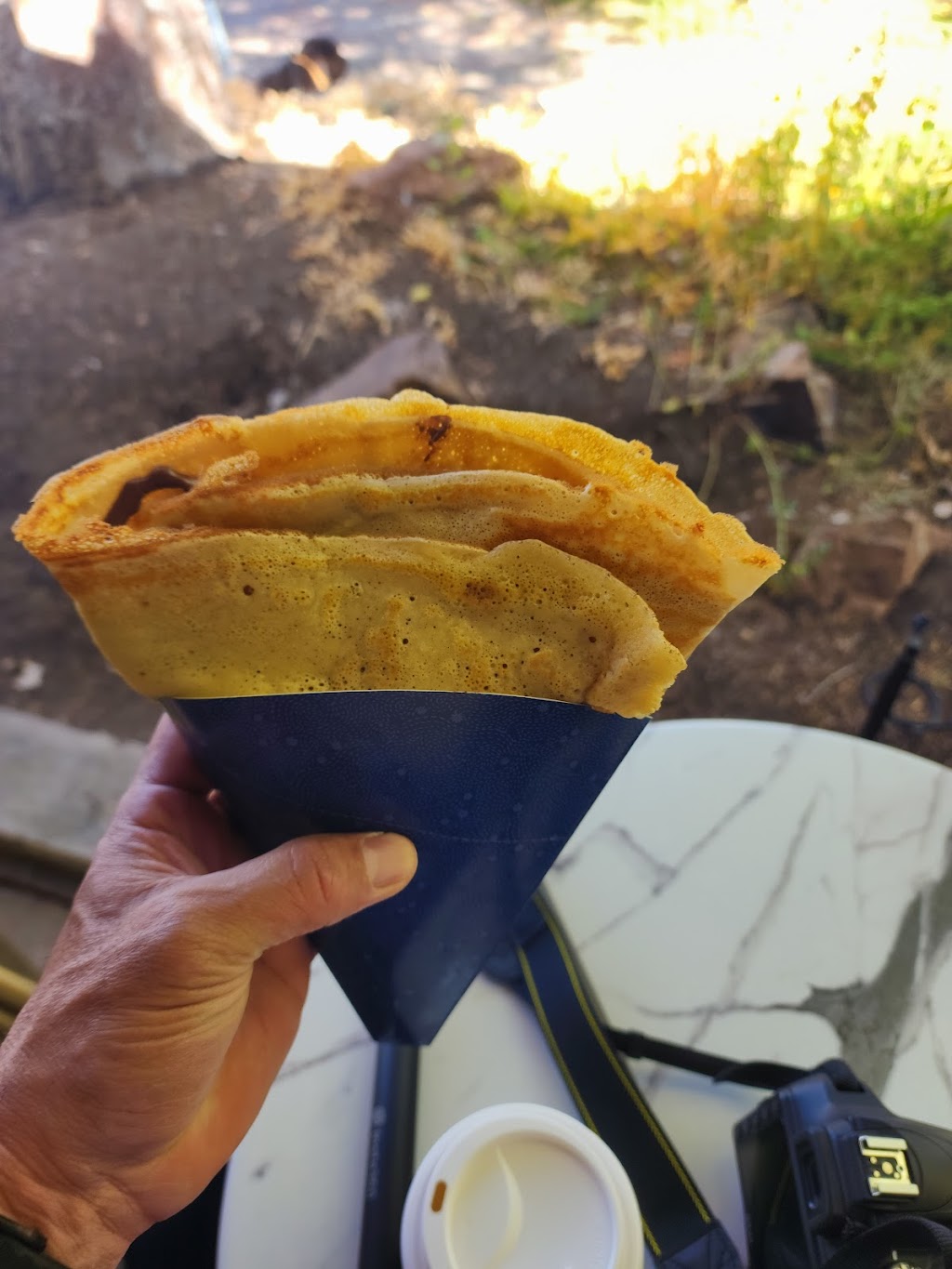 Excellent food, I had the breakfast meat and cheese crepe. Definitely enough for 2. Atmosphere consists primarily take out after ordering at the counter. Service is quick. Recommended.