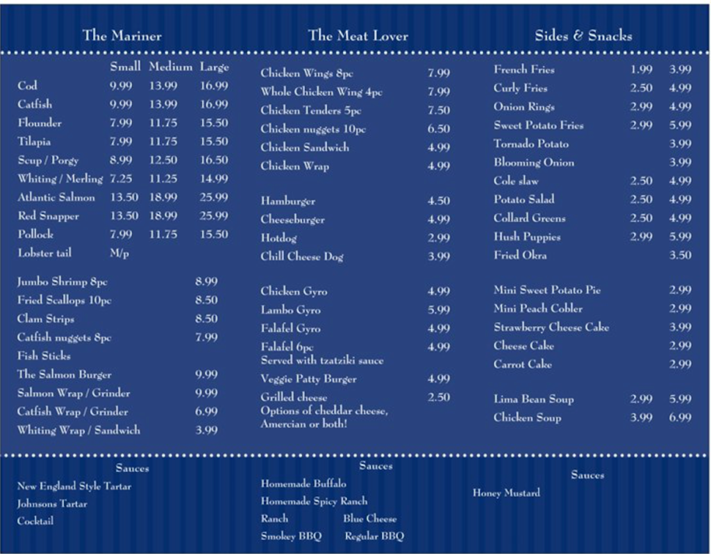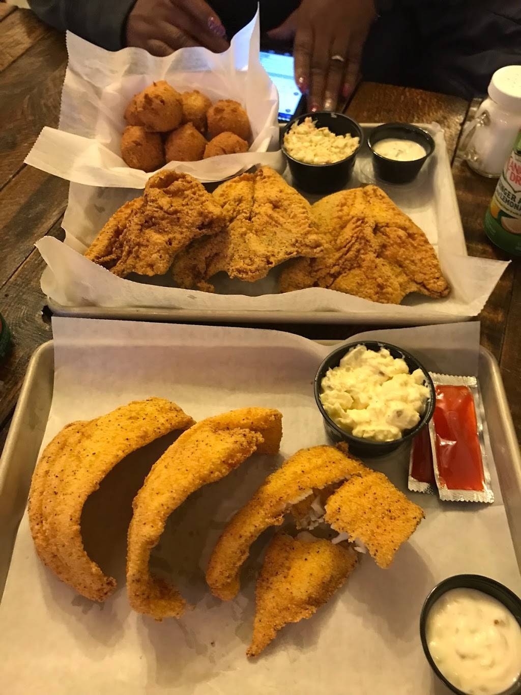 Great food! We ordered take out last night and we ordered from here to get a taste of how it was. It was way better than we expected. Normally seafood for takeout means it would be soggy. Not here. Everything was crispy and very tasty, even the french fries. With our family we had ordered the breaded salmon, cod and shrimp. All were very good and crispy. One thing to note, the breading was cornmeal and not the typical breading. I will definitely be back many times.