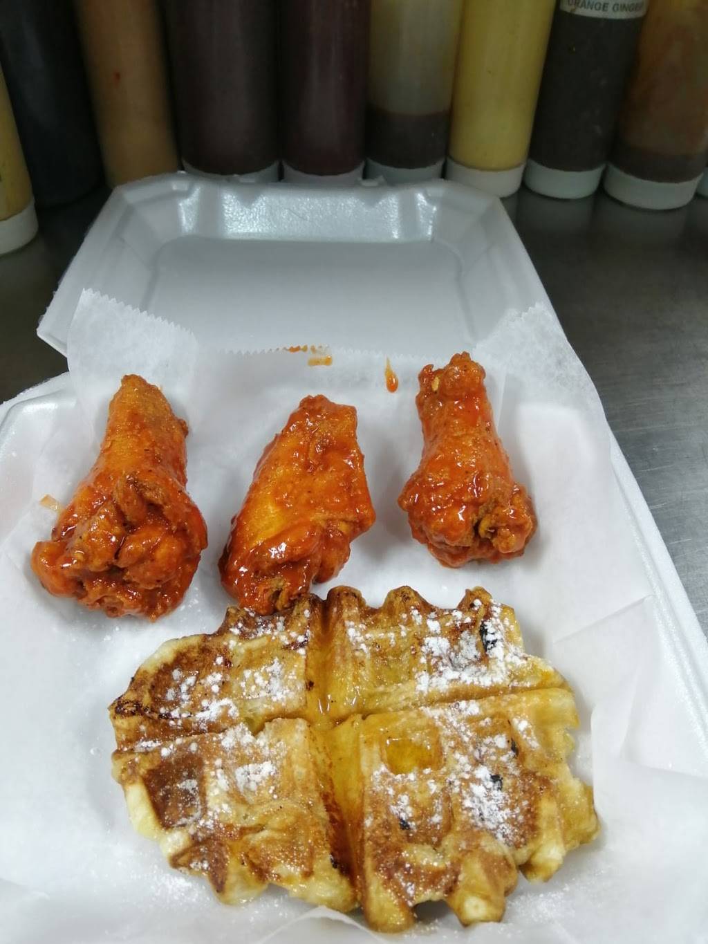 First time here, but not the last. I ate the regular chicken waffle sandwich with a golden sauce and also got some buffalo wings. Tender meat, not doused in salt, and the golden sauce had a gentle sweet taste. Food was piping hot after my 20 min. ride home, too. I’m glad the restaurant moved here. I wish there was a paper menu to go with the online menu, but I guess that’s good for the environment. I was struggling to read the menu screen above my head.