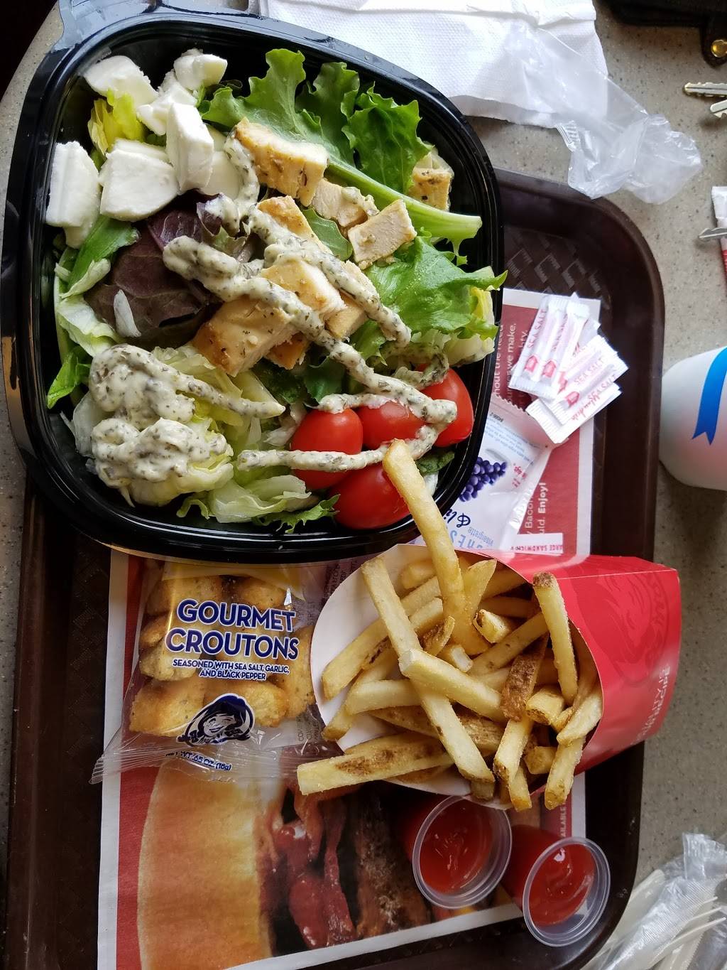 It's Wendy's, not much more needs to be said. Everybody knows what to expect when you go there. It's called Fast food for a reason. U can't get gourmet food in a drive-thru!