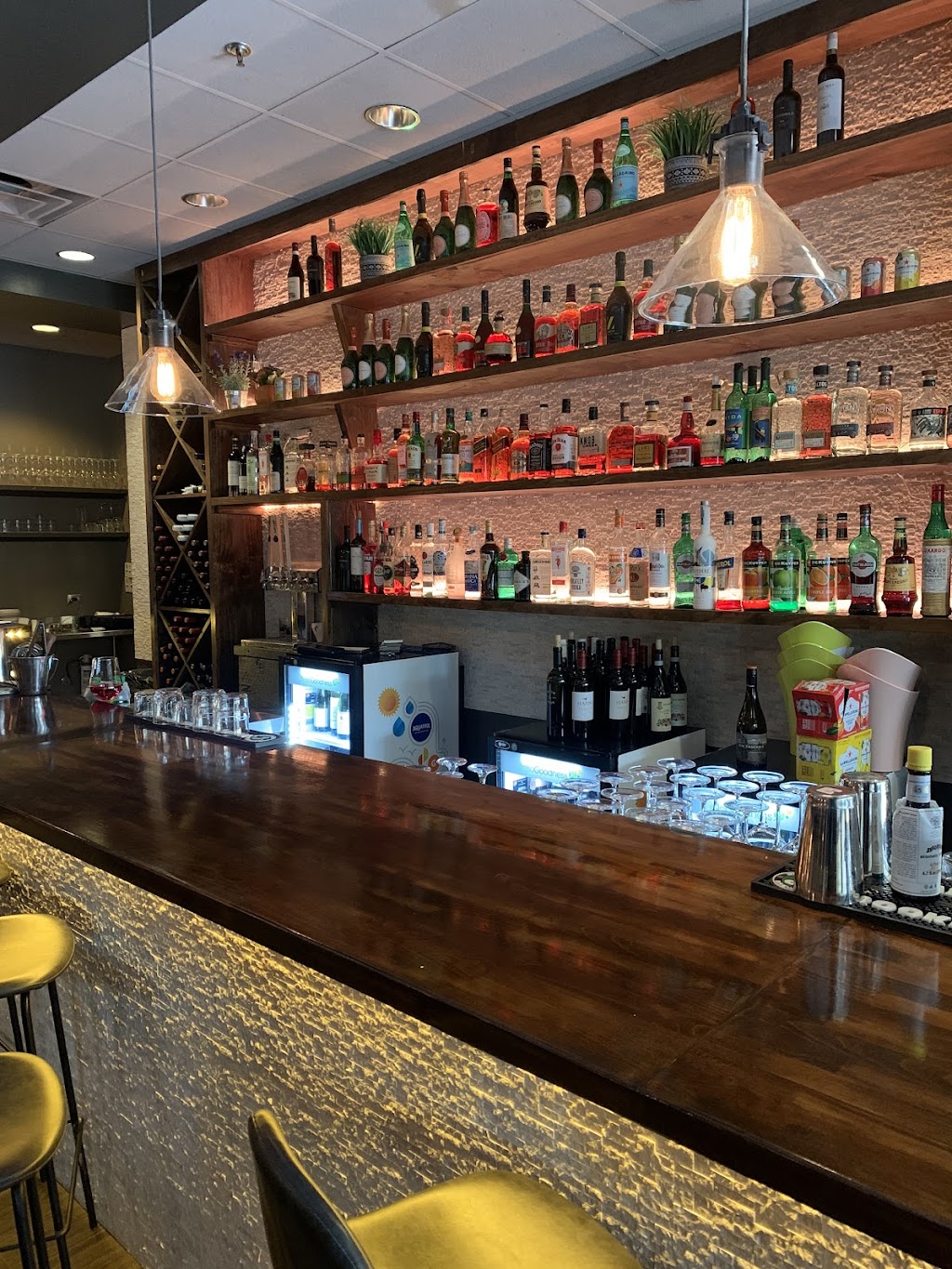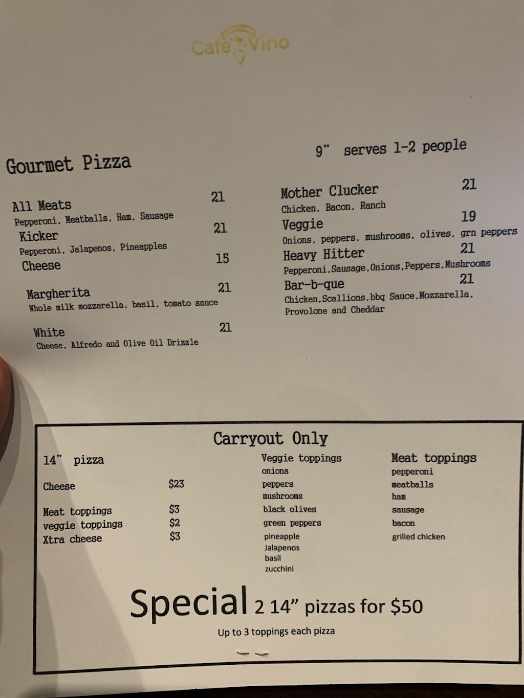 “Cafe Vino” is very cozy neighborhood Wine 🍷 Bar with beautiful lighting and great ambiance. Pizza is delicious made with fresh ingredients. My personal favorite is spicy lightly fried cauliflower with blue cheese sauce is an excellent appetizer. Owner Nick is very friendly and attentive and goes above & beyond to make sure that the guests will have an amazing experience. The Bar is beautiful and very clean. I will gladly come back again & again.
