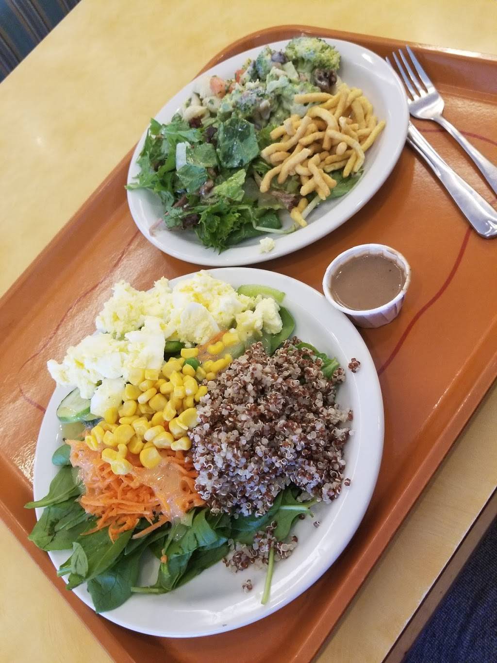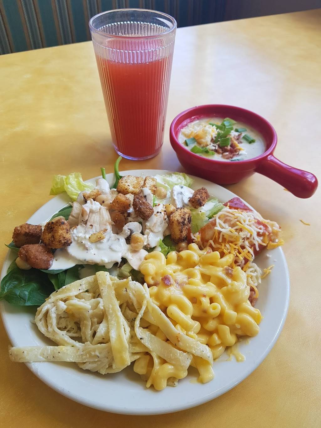 Excellent Salad & Soup buffet restaurant. Salads are meticulously maintained fresh. Soups are outstanding with usually 5-6 interesting choices. (Hint: the Chicken Noodle Soup is incredible - big chunks of white meat chicken, wide dumpling/noodle strips!). Baked potato bar and fresh baked breads/pasta. Excellent place for vegetarians (although a few items like the chicken noodle soup, obviously are not). Clean restaurant and friendly staff!