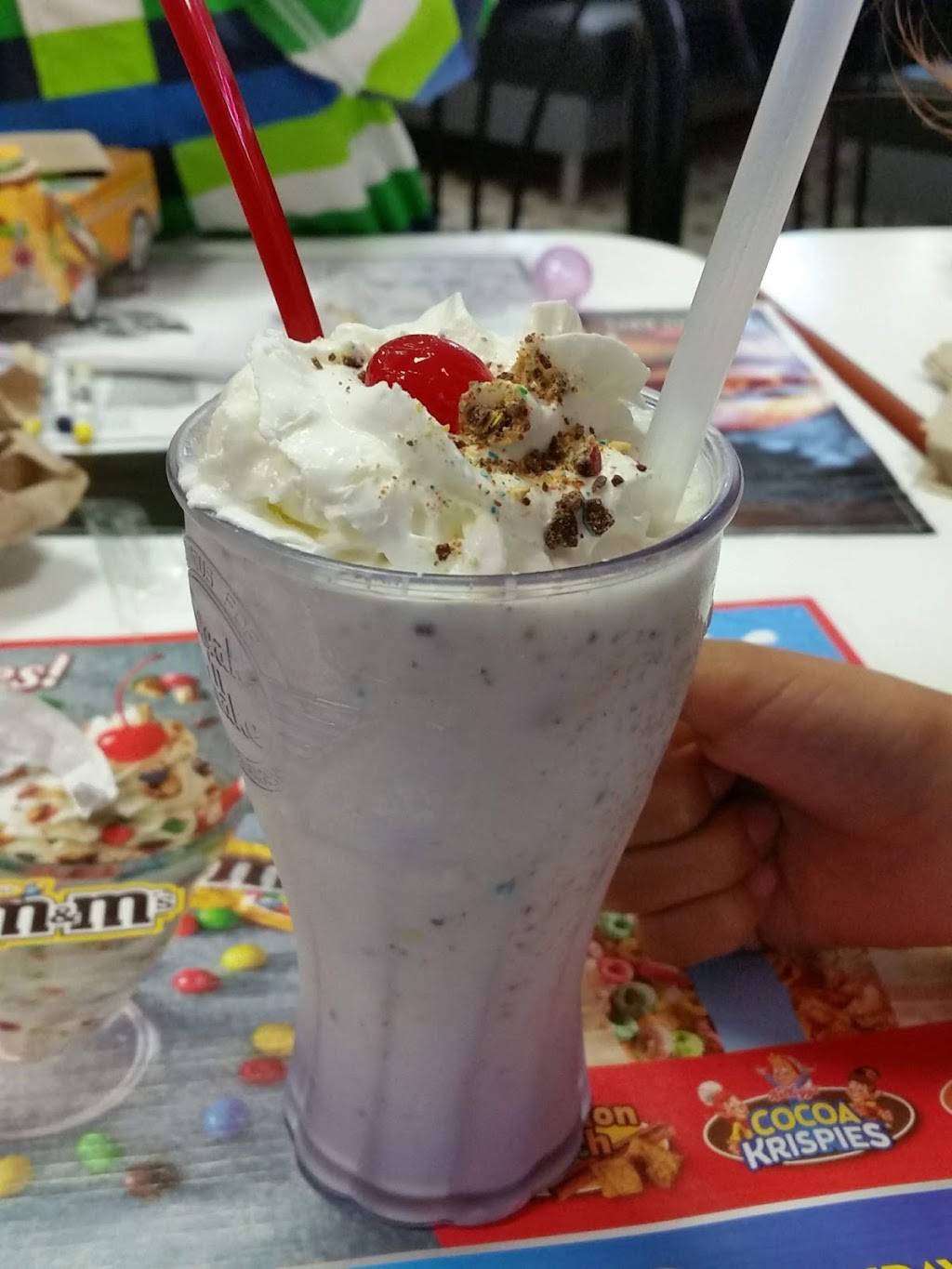 Pleasant waitress, friendly patrons, and a thick shake for the one who asked! We were treated with cookies to enjoy with friends at another table. The staff went out of their way to make us welcome.