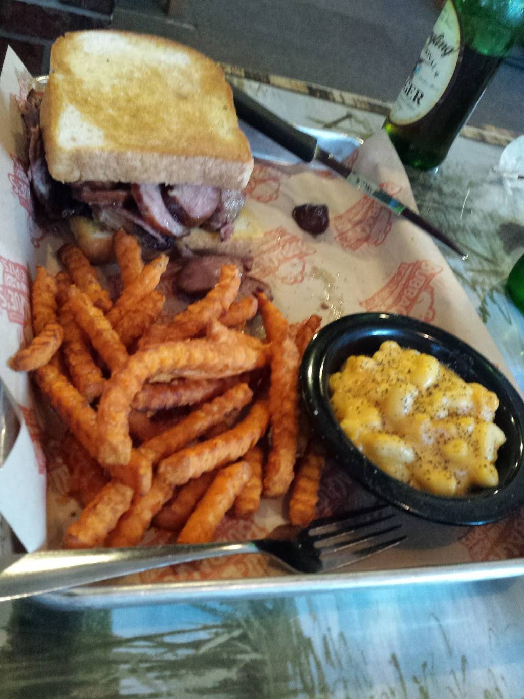 Four of us had lunch here and thought the food was excellent! We each ordered different things and everything was delicious. I had the brisket sandwich and fries okra. The brisket was extremely moist and tender and the ones was very lightly battered and crispy. My husband ordered the Firebird which was a sandwich with smoked chicken, onion rings, cheddar cheese with a tasty sauce and the best jalapeno poppers ever! My sister-in-law had the St. Louis ribs which she said were very tender and delicious, while my brother ordered a Texas sausage sandwich with chili that he said was very good as well. We will definitely come back here again soon!