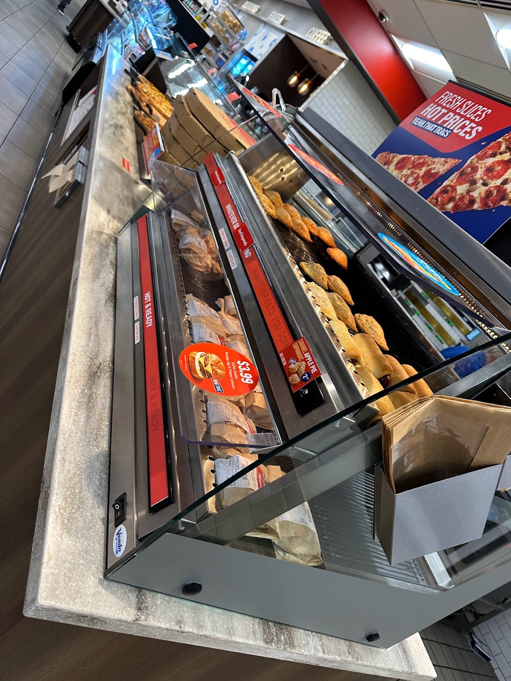 Still has that "new gas station smell." Lots of pumps including some for semi trucks and large boat trailers. The restrooms are really clean and they have a giant selection of snacks and drinks. Also Pizza by the slice.