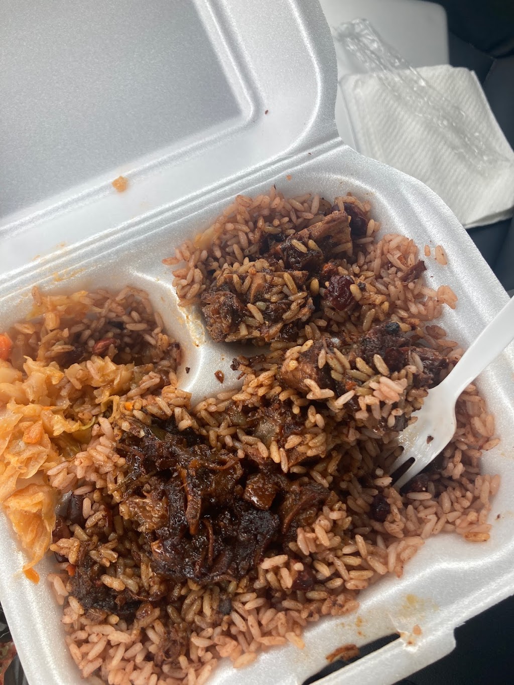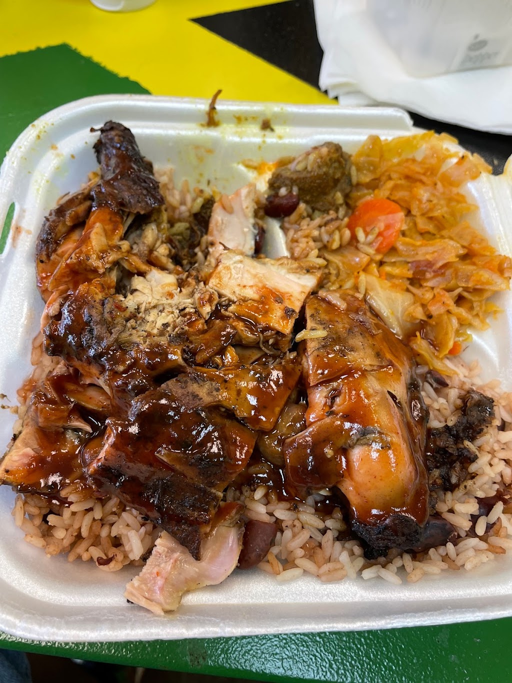 Had the jerk chicken with rice and peas, cabbage and green beans. Loved it all. Tender spicy chicken. Could have enjoyed more cabbage, which was a little sweet, had carrots, and was cooked perfectly. Oh, that rice and peas was good to the last kernel and legume. Kind owners. Will definitely go back.