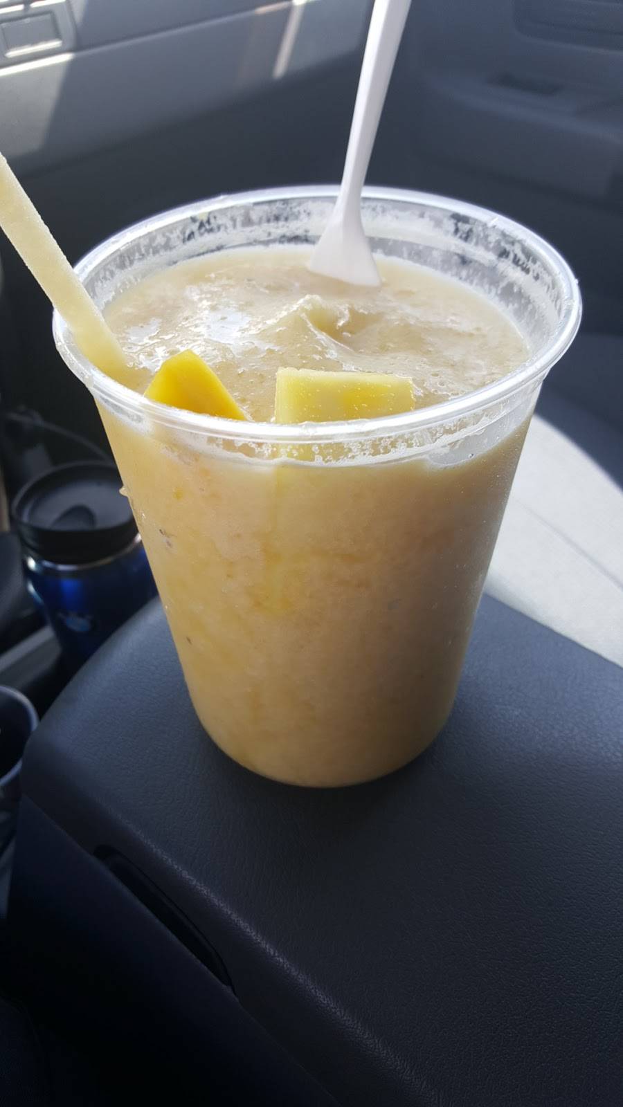 Wow what a smoothie, tastes awesome and the size!! $5 amazing and he even puts chunks of your fruit on top of it. What a great find!! Will definitely be back next time I'm in the area
