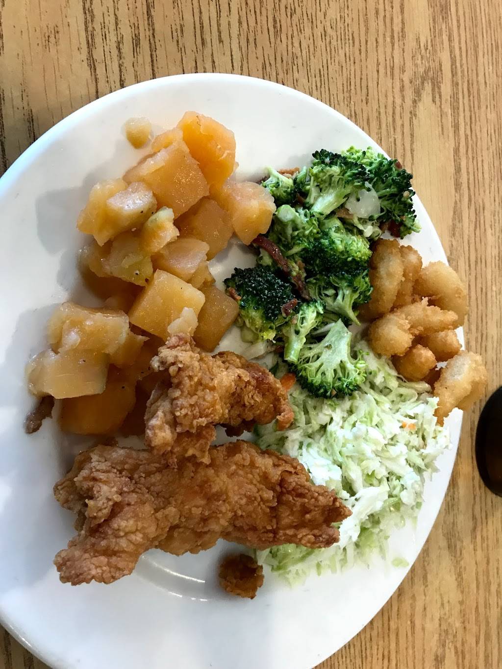 Great selection of Southern food for a small town buffet. My kids loved the fish...it wasn't too greasy! There's a salad bar as well. The waitress even offered the kids fries since they were getting the buffet. Vanilla and strawberry ice cream cups were included for dessert . The service was perfect and the food was tasty. I did expect banana pudding or peach cobbler, but didn't need it so I'm not complaining since we are for less than $20.