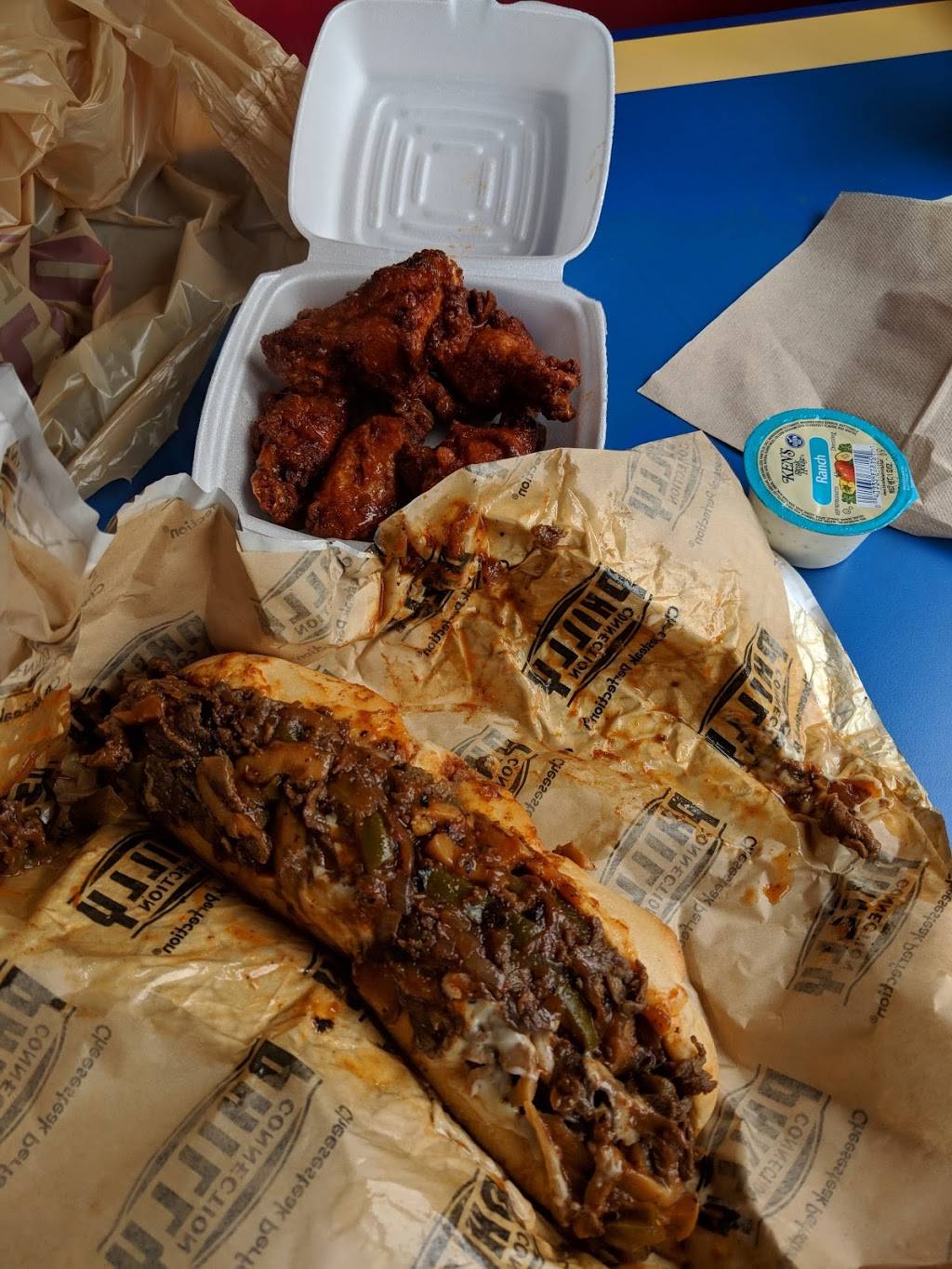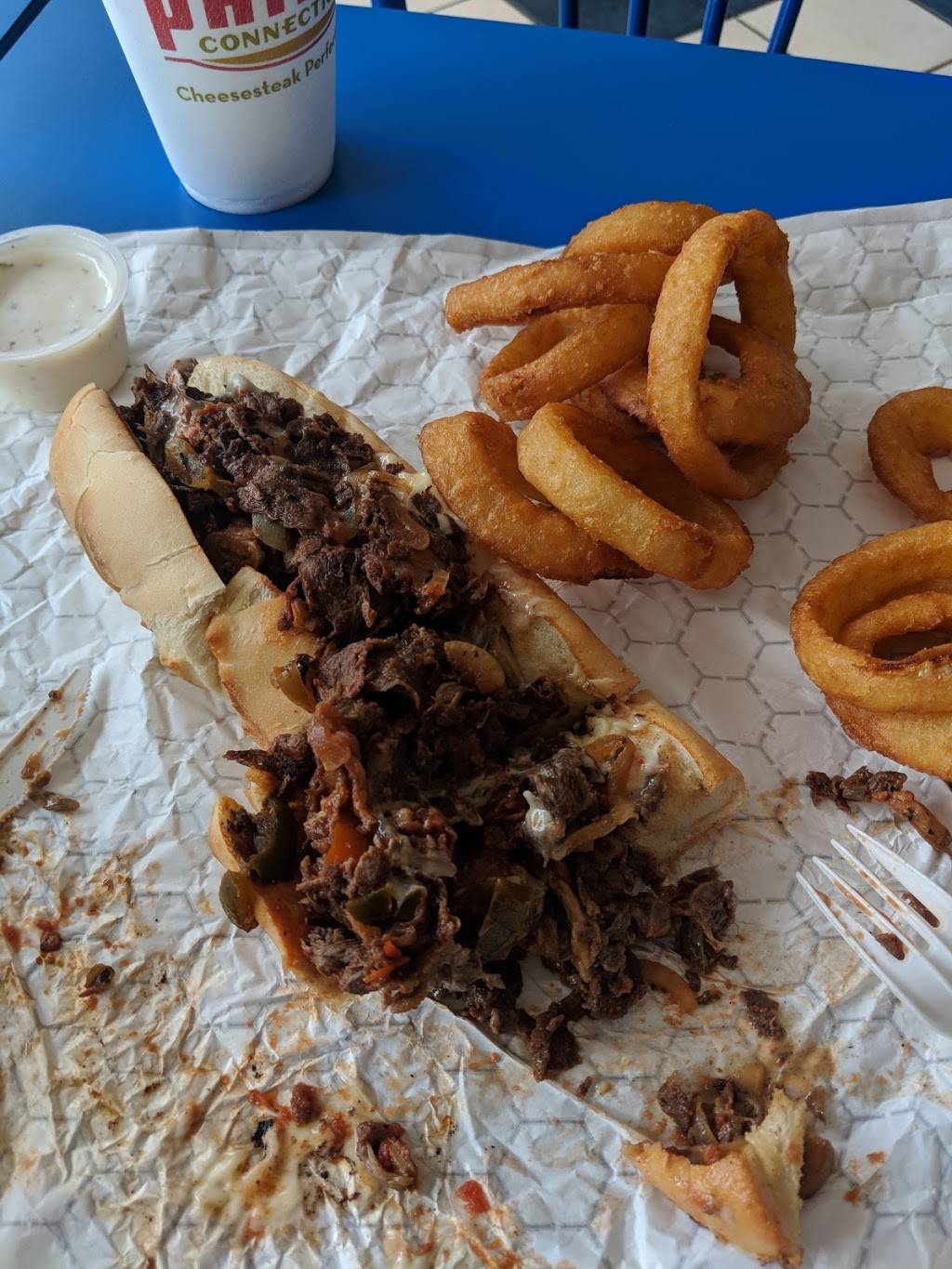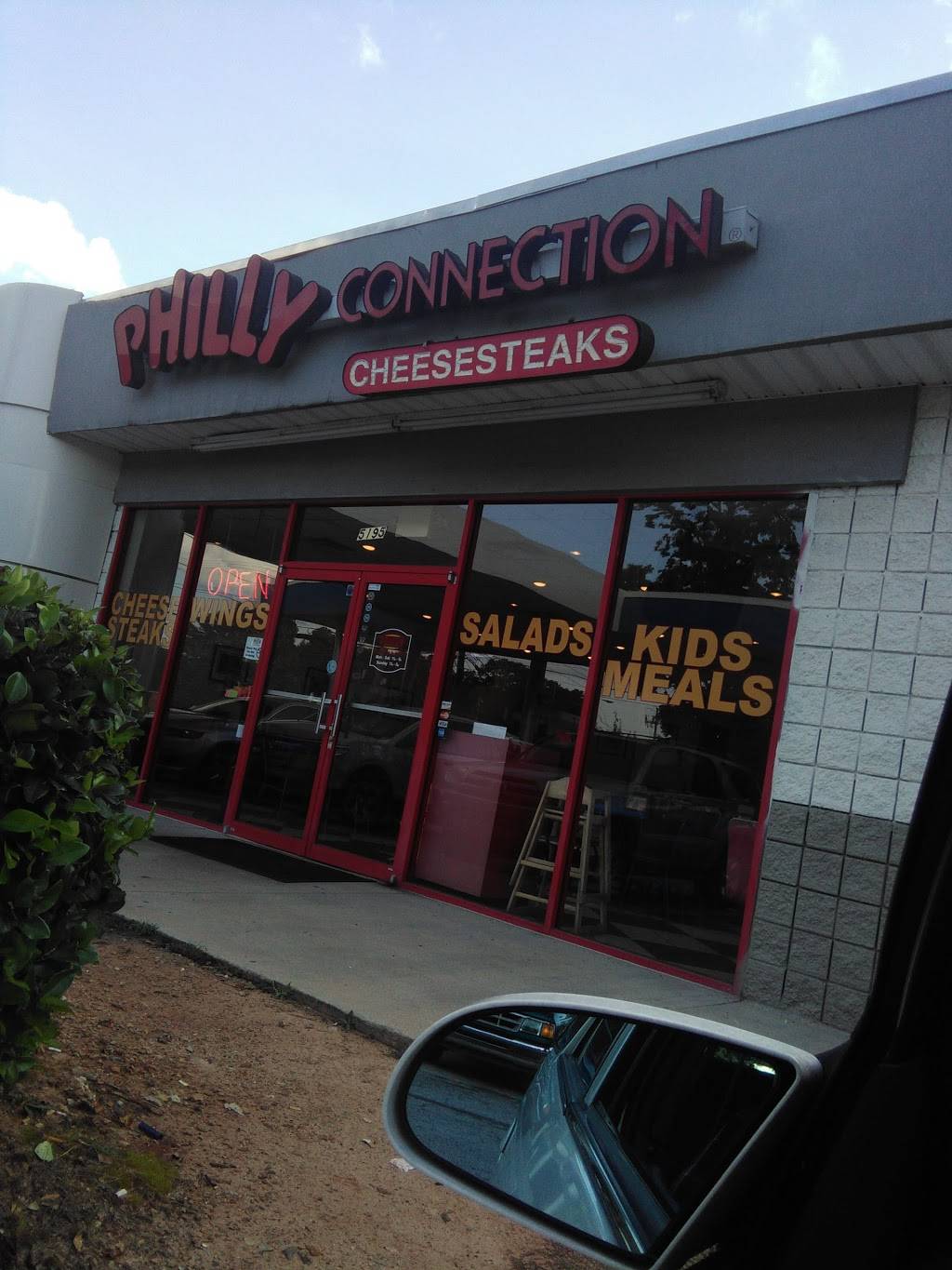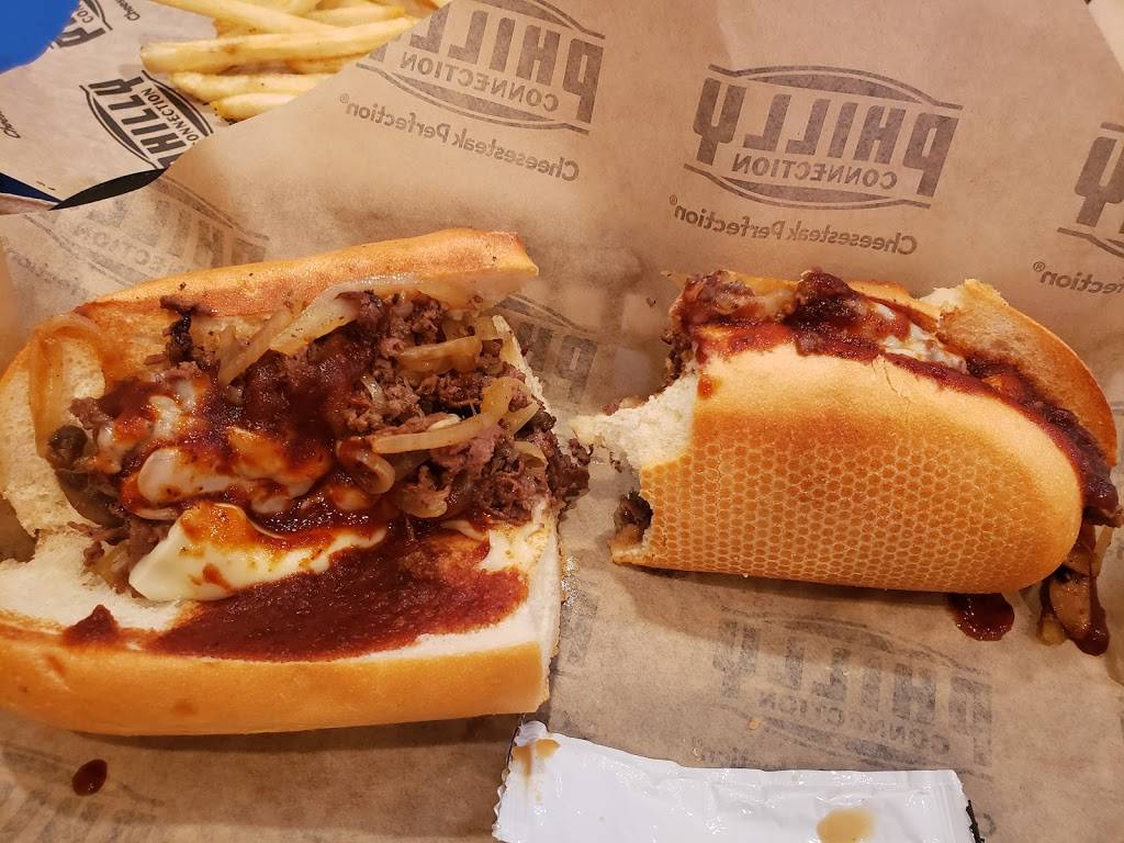 Located next to a gas station. Missed it on the first pass. Inside was moderately clean- things looked sticky, but there was no trash on the floor. Tables felt like they were wiped with a sticky rag. It was rather warm but that was because its July in GA and there were no window coverings/shades/tint. Dated and sun-faded decor. Ordered Plain Janes, both loaves of bread were split completely in half and older, rather than the normal fashion of split down the middle so nothing falls out. French fries were hot, fresh. Chicken tenders were clearly frozen before cooking and not seasoned, though the kid slathered them in ketchup just fine. Love Philly Connection but will drive the extra 15 minutes to a further location next time.