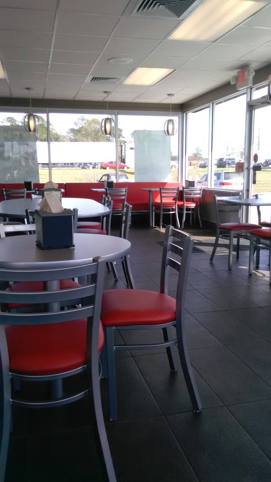 The restaurant was clean. The guy behind the register was friendly, but he pushed the full garbage down with his bare hand. We also don't like sweet bread on our burgers and my chicken breast was not freshly cooked.