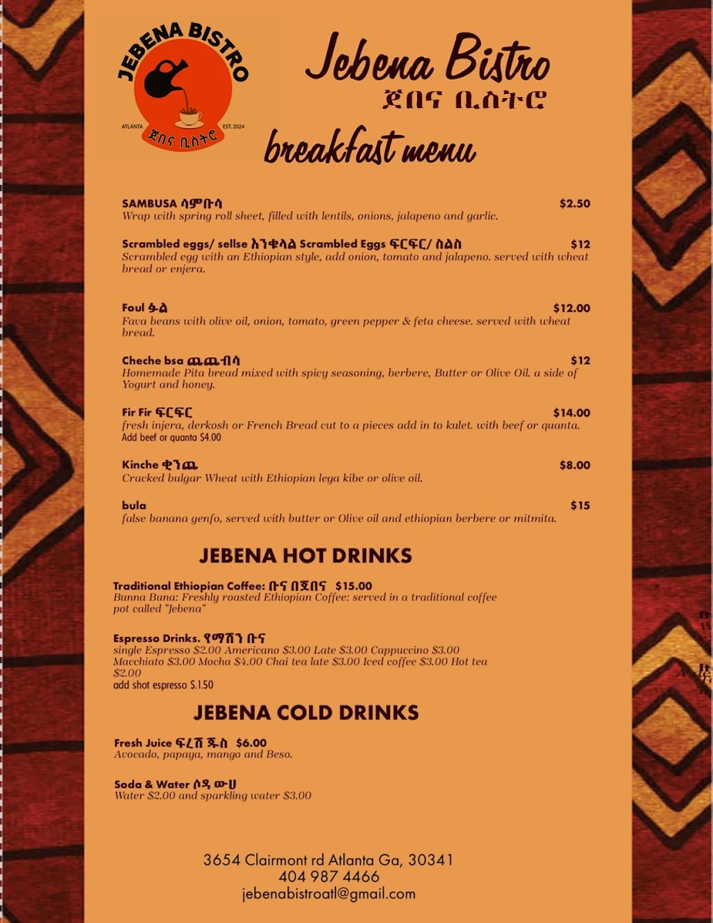 What a gem and nice spot in Atlanta. I am a foodie and I’ll give you a heads up that you will be obsessed with the food they serve! If you are in the mood for excellent food at a reasonable price, with great service and a wonderful atmosphere, go to this Ethiopian Restaurant. The food was amazingly fresh and delicious. We ate beef tip and grilled tilapia served with Ethiopian bread “Injera” that’s used to sop up the other parts of flavorful meal. The meat and fish are perfect seasoned and cooked, they are so tender and full of tasty seasons. The owner lady Messi is super friendly, she’s not just good in cook and host, but also very knowledgeable about both American cultures and Ethiopian culture. We really appreciate the way she managing her restaurant. We felt comfortable and relaxed. One of the best experience trying out food and the best Ethiopian food I’ve had in Atlanta. We would definitely return again in a heartbeat, and tell our friends who appreciate good people, good food to try Jebena Bistro, too. Thank Universe!!!