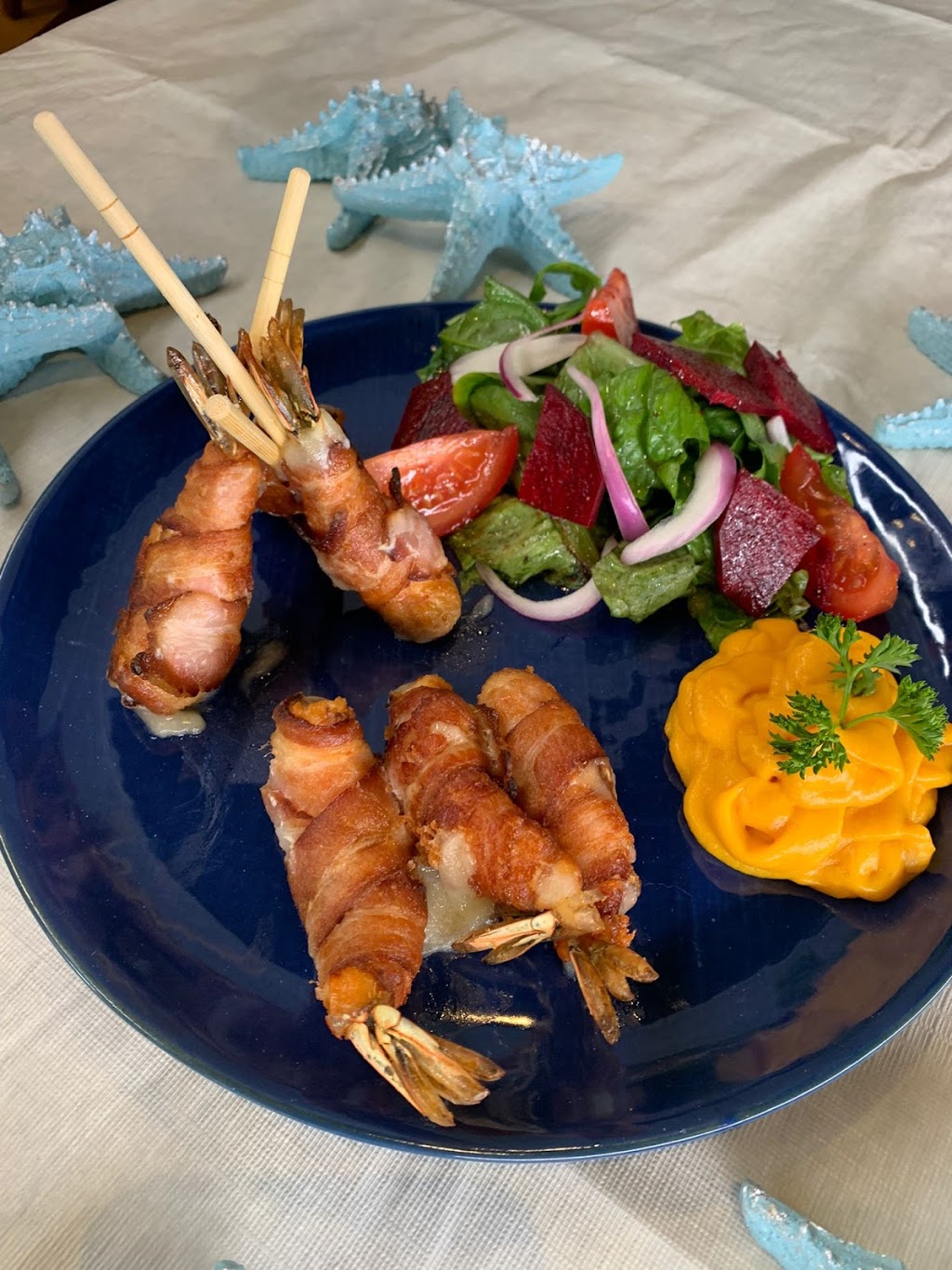 Great food and drinks! Started with grilled oysters which were excellent. I enjoyed the fish stuffed with shrimp and octopus, while my spouse had very delicious shrimp wrapped with bacon. We finished with a yummy Tres leeches cake. The margaritas were top shelf!