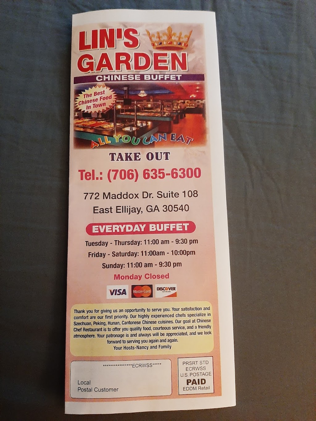 Consistent fresh food, very nice selection, service has gotten much much better, staff are very pleasant, and we highly recommend. Lin's Garden is also very reasonably priced. Keep up the good work!!!!!!