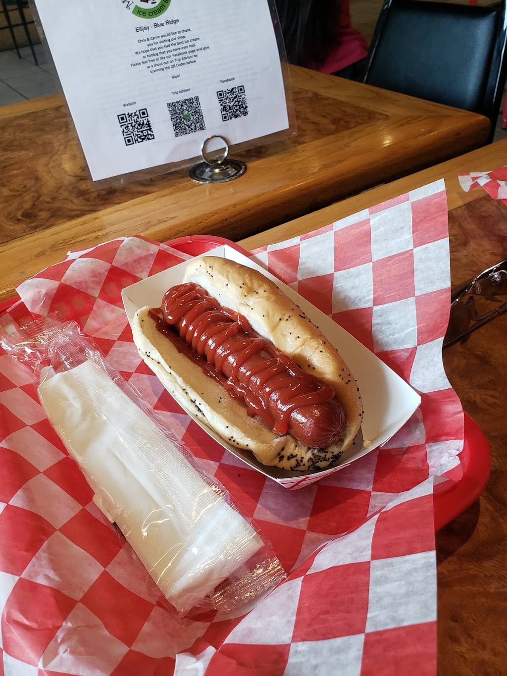 We were served immediately by polite and friendly staff. We loved our Rush Hour ice cream. A clean and fun establishment offering hot dogs, shakes, malts, craft soda, Moon Pies, candy by the pound and tee shirts. Several chairs and tables, two bar areas for seating and two benches (no tables) outside. Cute family story behind this place and nice home feel.