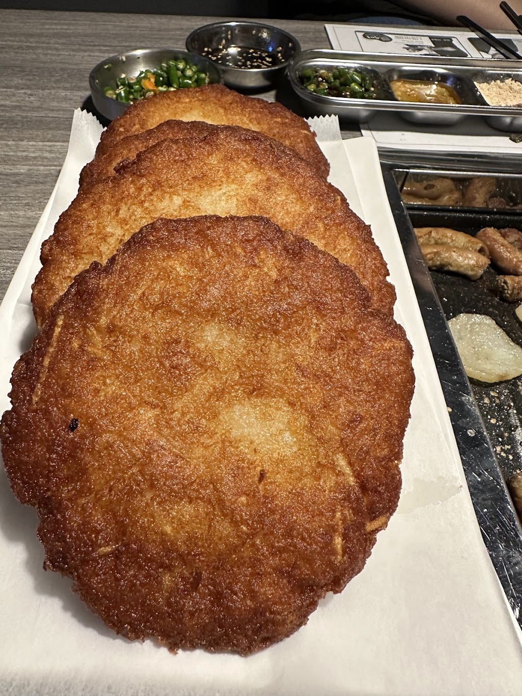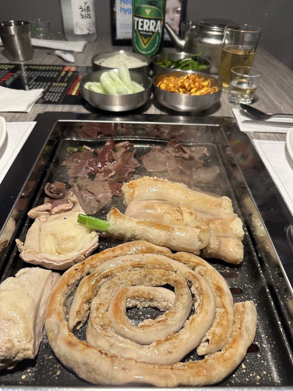 Walked in on a Friday night around 6 pm and wasn’t packed at all. We ordered Set A. Service was quite fast and the server grilled everything well. Enjoyed the ice cold Korean beer and soju. Then we decided to order the tasty 감자전 Korean potato pancake and it was really good. Great portion size and delicious side dishes especially the bean sprouts. Took our time eating and drinking until closing time.