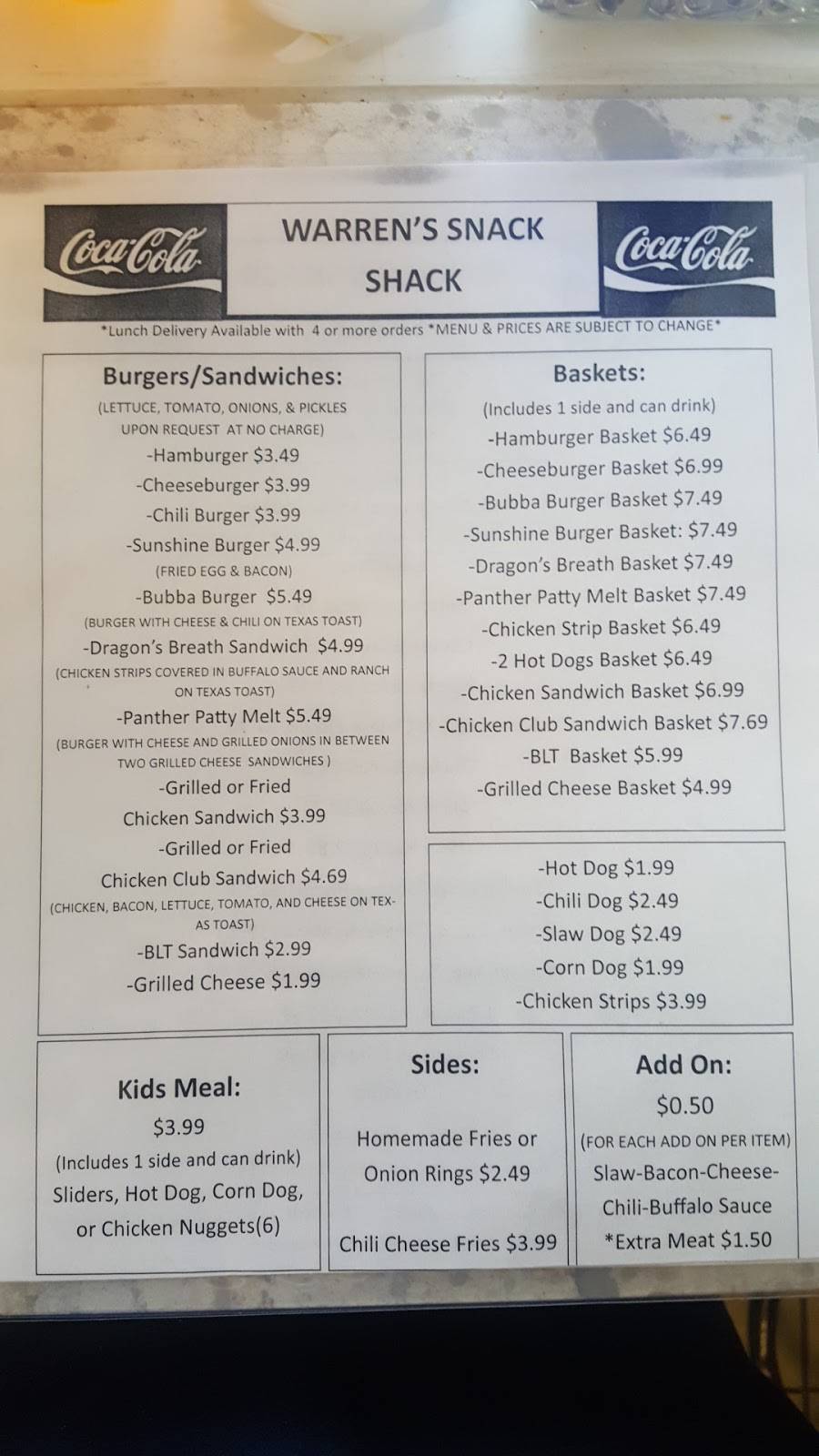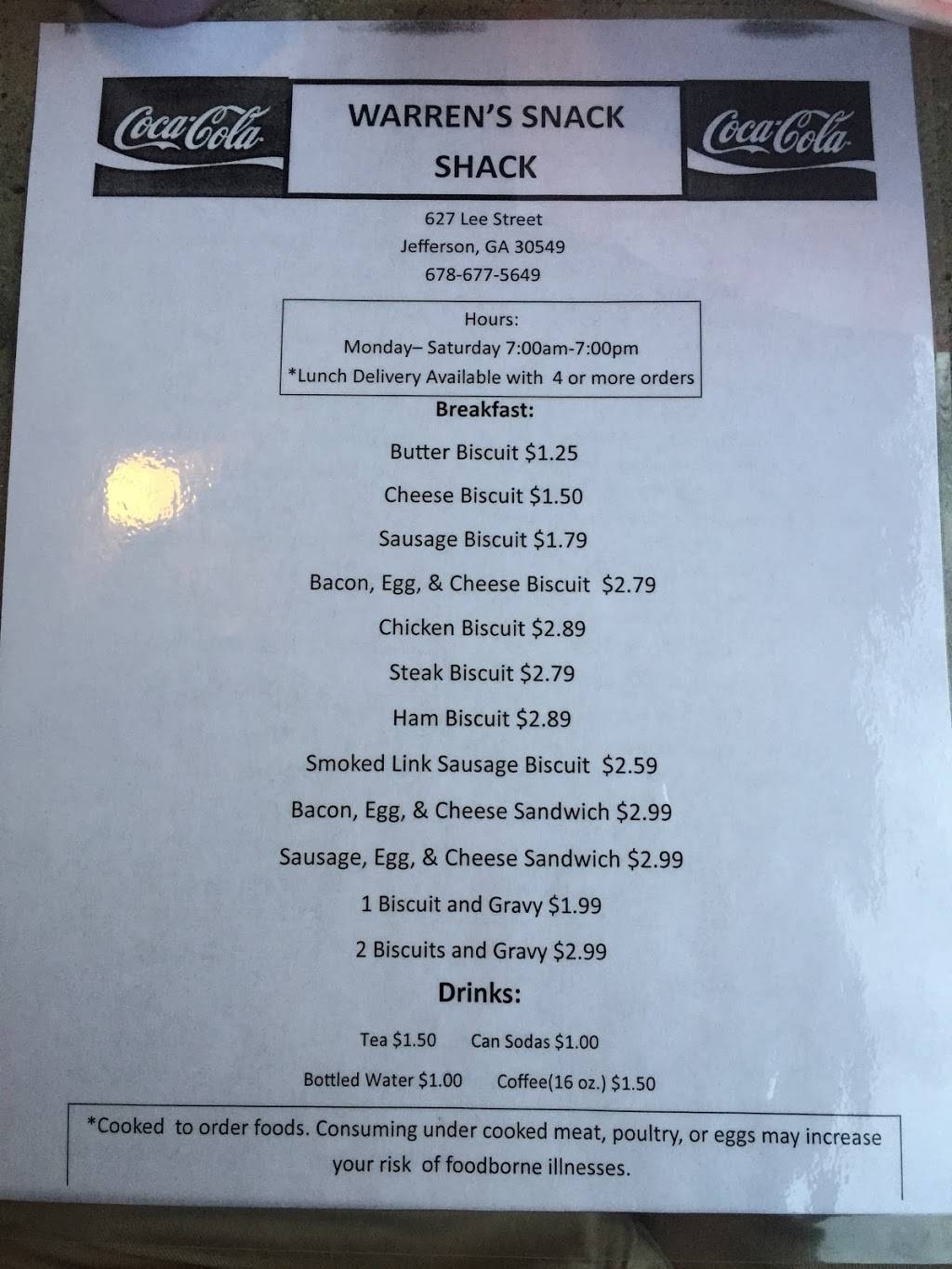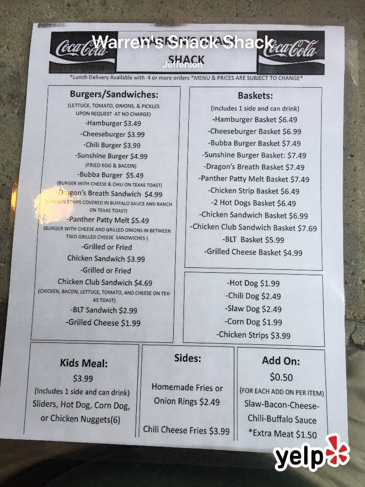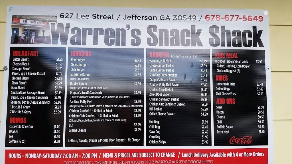 Warren's Snack Shack has delicious homemade burgers and dogs at very reasonable prices. They also serve biscuit sandwiches or platters for breakfast. This is one of my family's favorite places to eat which is nice because it is also easy on the wallet. If you are in Jefferson, you simply must stop at Warren's Snack Shack.