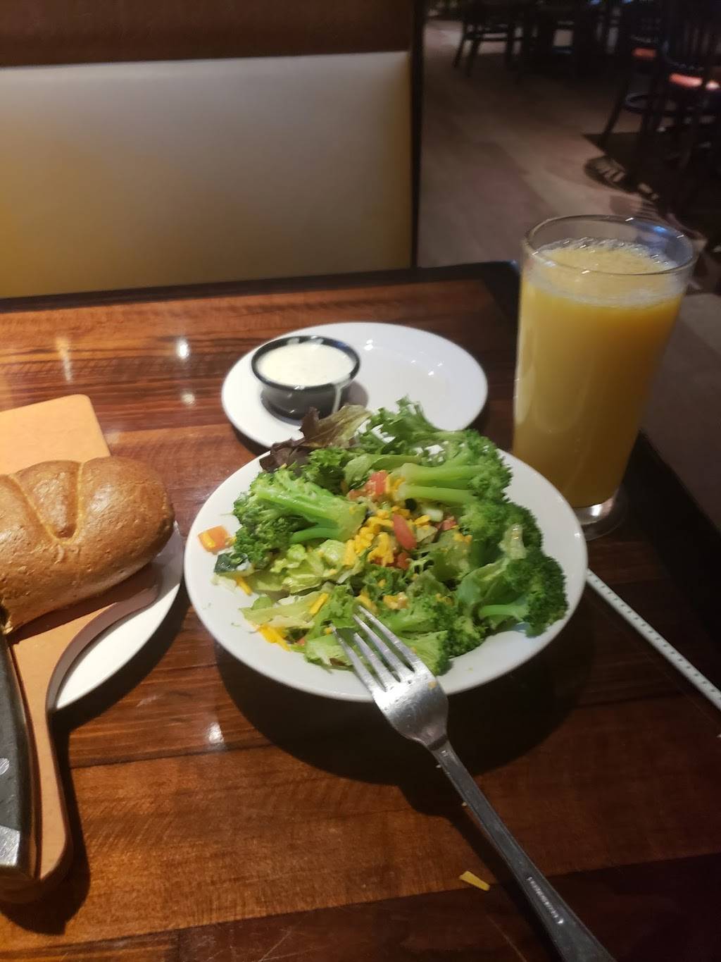 Food is really good. Service was friendly and fast. They don't have the largest selection for non-steak items but still some really good meals. They have paper and crayons for kids to be entertained by and you get bread while you wait. The tonion is really delicious and breaded much better than blooming onion type appetizers. My husband said it was one of the best seasoned steaks in that the seasoning was good and didn't cover the taste of the meat. Highly recommend.