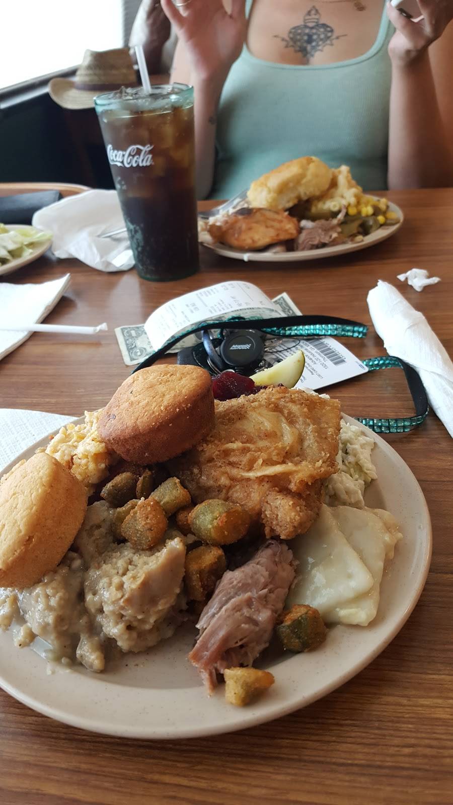 Small town southern feel. Food was very tasty. Everything I tried was pretty good. Just enough seasoning!Baked chicken, collard greens, fried chicken, corn all good!