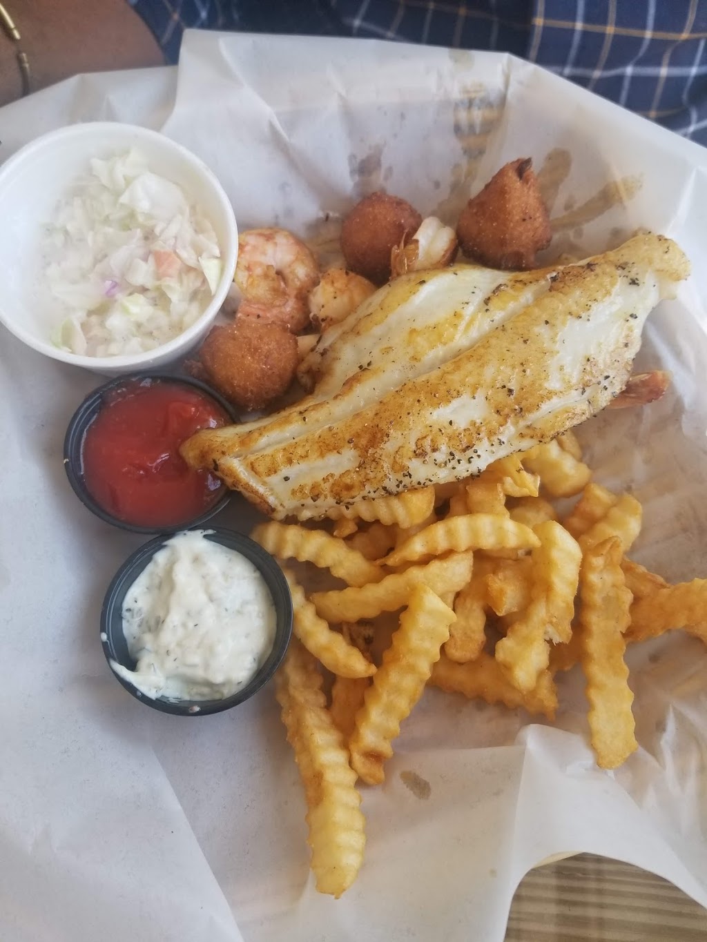 Saturday lunch. Shrimp and fried oyster dinner. $19 for 5 small shrimp, 5 smallish fried oysters, 3 hush puppies, cole slaw, and ample sweet potato fries. Everything tasted great, but prices are high.