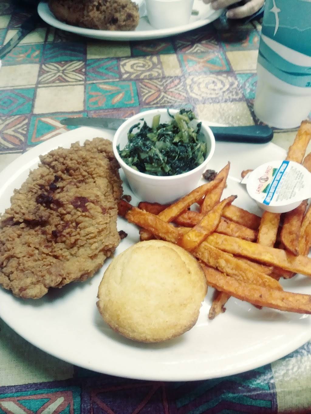 The boneless fried pork chop dinner with 2 sides and bread choice is delicious! Turnip greens and sweet potato fries with cornbread muffin and sweet tea completed supper tonight.