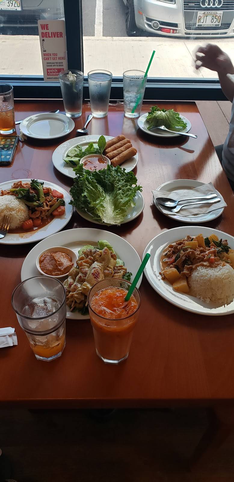 The Pad Ki Mao aka drunken noodle is amazing. First Thai restaurant my wife and I tried since moving to Oahu. She got the Pad Thai which she says is also very good. I'm surprised that we're the only ones in here right now seeing that it's prime dinner time. Needless to say our meals came out hot and fresh pretty fast.